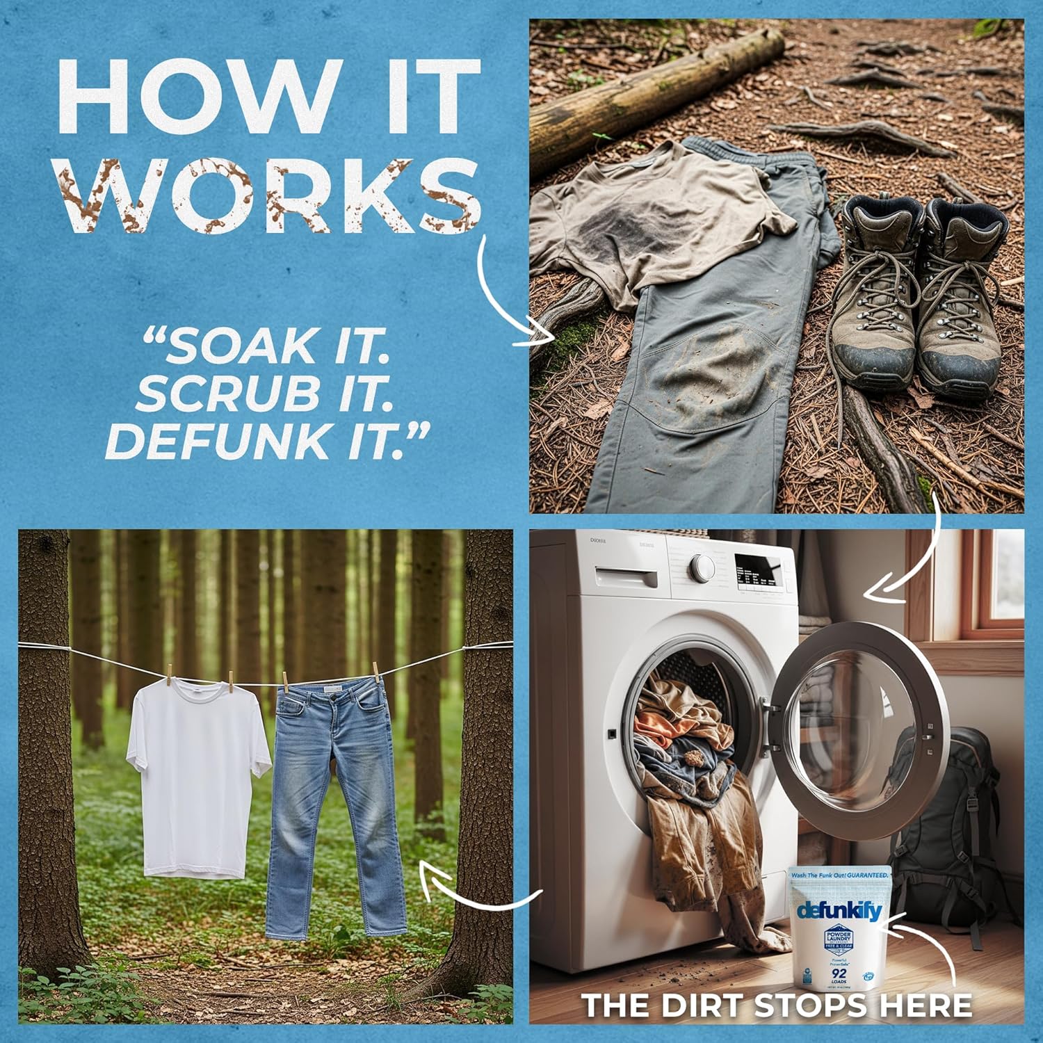 - ๐ช๐ฎ๐๐ต ๐๐ต๐ฒ ๐๐๐ป๐ธ ๐ข๐๐!' ๐๐๐ฎ๐ฟ๐ฎ๐ป๐๐ฒ๐ฒ: Defunkify's laundy detergent enzymes clean deep within fabric fibers to eliminate the residue, oils, sweat & heavy cover-up scents left behind by other washing detergents. As a scent free laundry detergent w/ all natural old odor eliminator & set-in stain remover ingredients, ๐๐ผ๐๐ฟ ๐ฐ๐น๐ผ๐๐ต๐ถ๐ป๐ด ๐๐ถ๐น๐น ๐ฏ๐ฒ ๐น๐ผ๐ผ๐ธ๐ถ๐ป๐ด & ๐ณ๐ฒ๐ฒ๐น๐ถ๐ป๐ด ๐น๐ถ๐ธ๐ฒ ๐ป๐ฒ๐ ๐ถ๐ป ๐ฎ ๐๐ถ๐ป๐ด๐น๐ฒ ๐๐ฎ๐๐ต, ๐ด๐๐ฎ๐ฟ๐ฎ๐ป๐๐ฒ๐ฒ๐ฑ. Learn more at Defunkify.