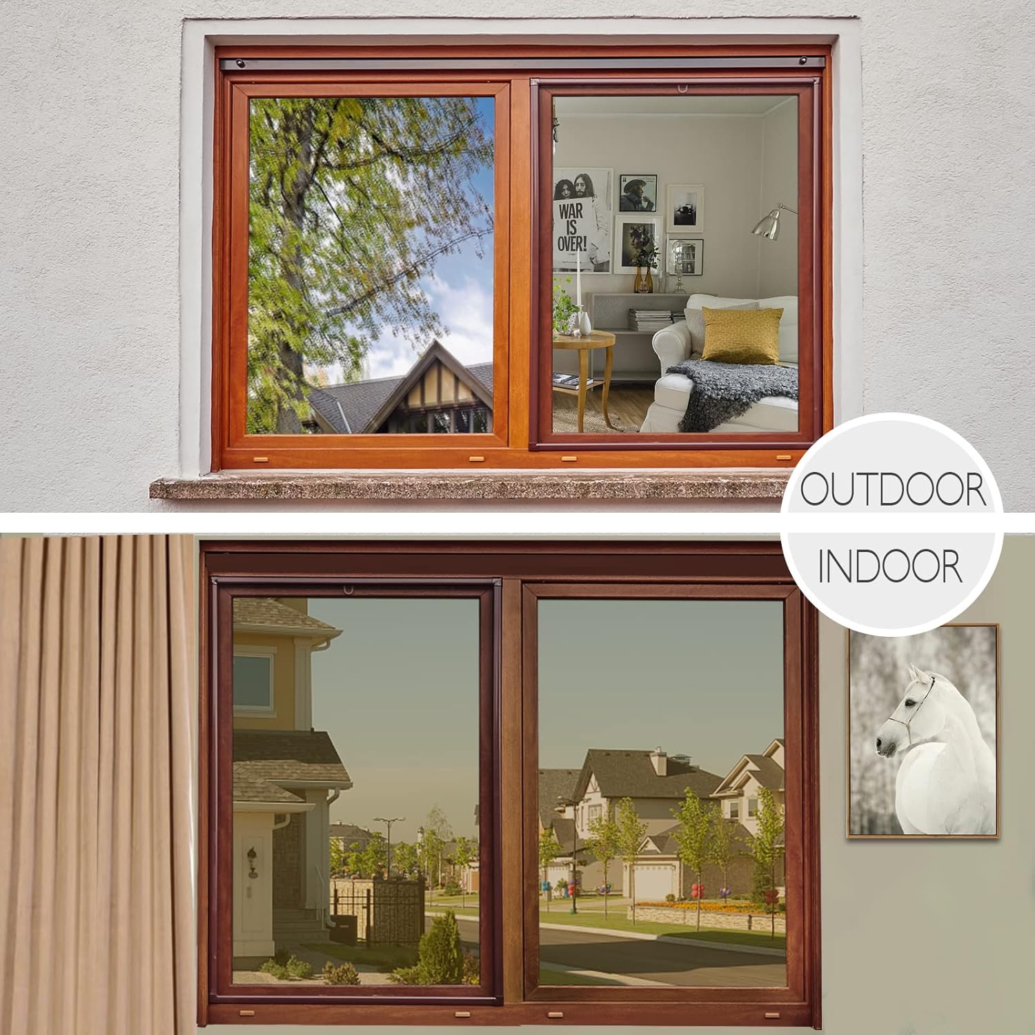 - SUPERIOR DAYTIME PRIVACY PROTECTION – Applying our window privacy film see out not in lets you see out and does not let prying eyes see in during daytime while letting natural lights in, and from the outside, the glass shows a mirror like reflective surface. NOTICE: When the inside light is stronger than the outside light at night, the window film privacy one way CANNOT provide privacy, and the mirror reflective effect will disappear. Do remember to draw the curtains during the night.raw the curtains during the night