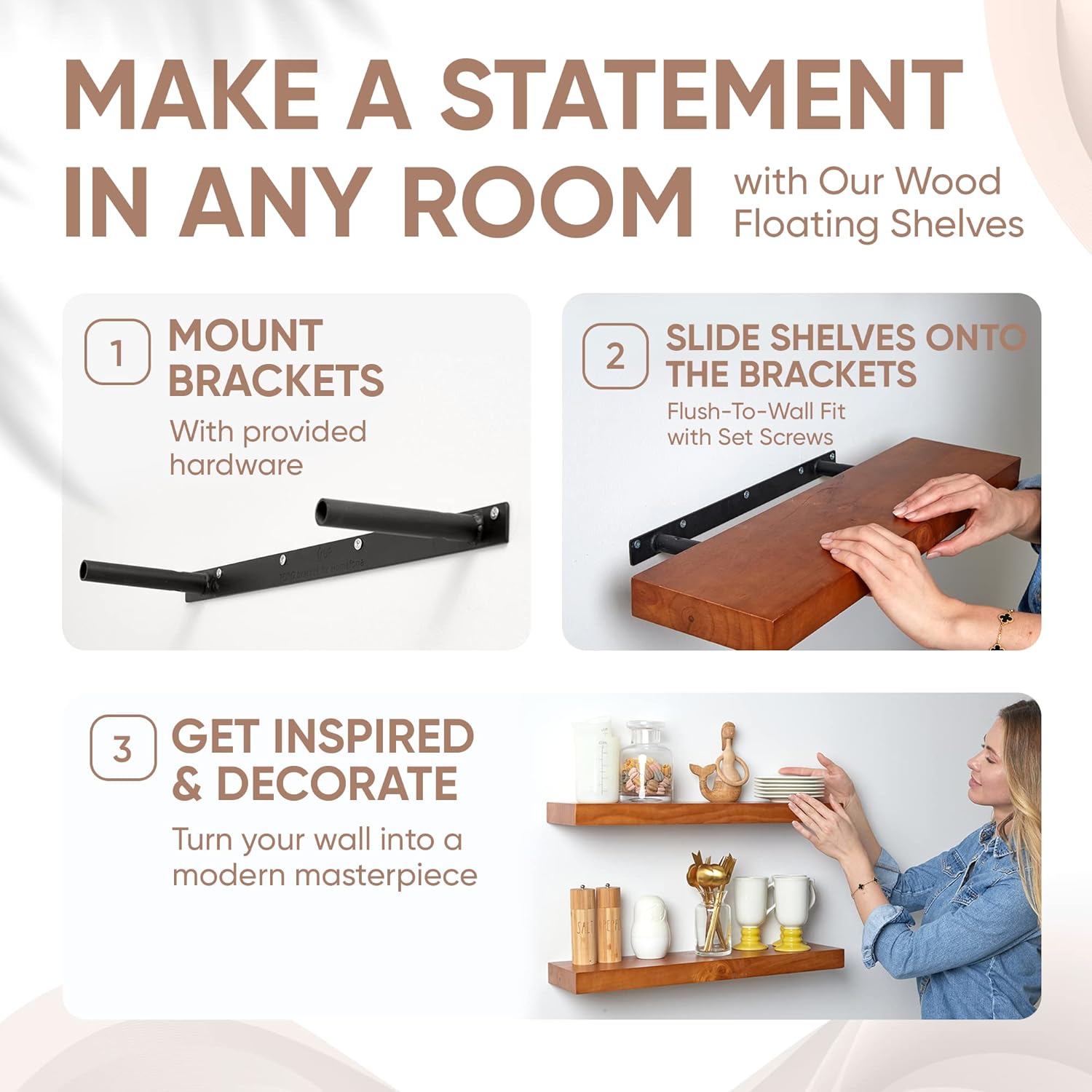 - AUTHENTIC WOOD GRAIN - Enjoy the timeless elegance of real wood. Handcrafted from the finest 1.75" Thick natural pine wood measuring 24" Wide x 6.5" Deep x 1.75". Our shelves highlight the inherent charm and durability of high-quality wood. Each Shelf reveals its unique character of knots and natural wood grain; each ledge is a little different but equally stunning.