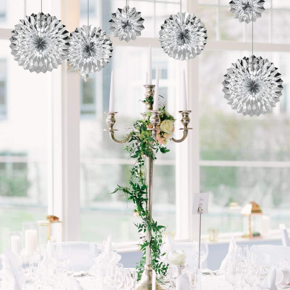- 【MATERIAL & SIZE】Paper fan flowers are preferably thickened paper materials. Each silver paper fans set includes 6pcs, three size(Diameter: 8 inch*2/ 12 inch*2 / 16 inch*2)