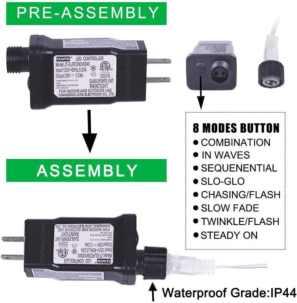 - 8Modes and easy to use:modes including combination, in waves, sequential, slogs, chasing/ flash, slow fade, twinkle/ flash, and steady on. Just use the plug button to adjust 8 modes setting .directly plug in and unplug it for power on and off.