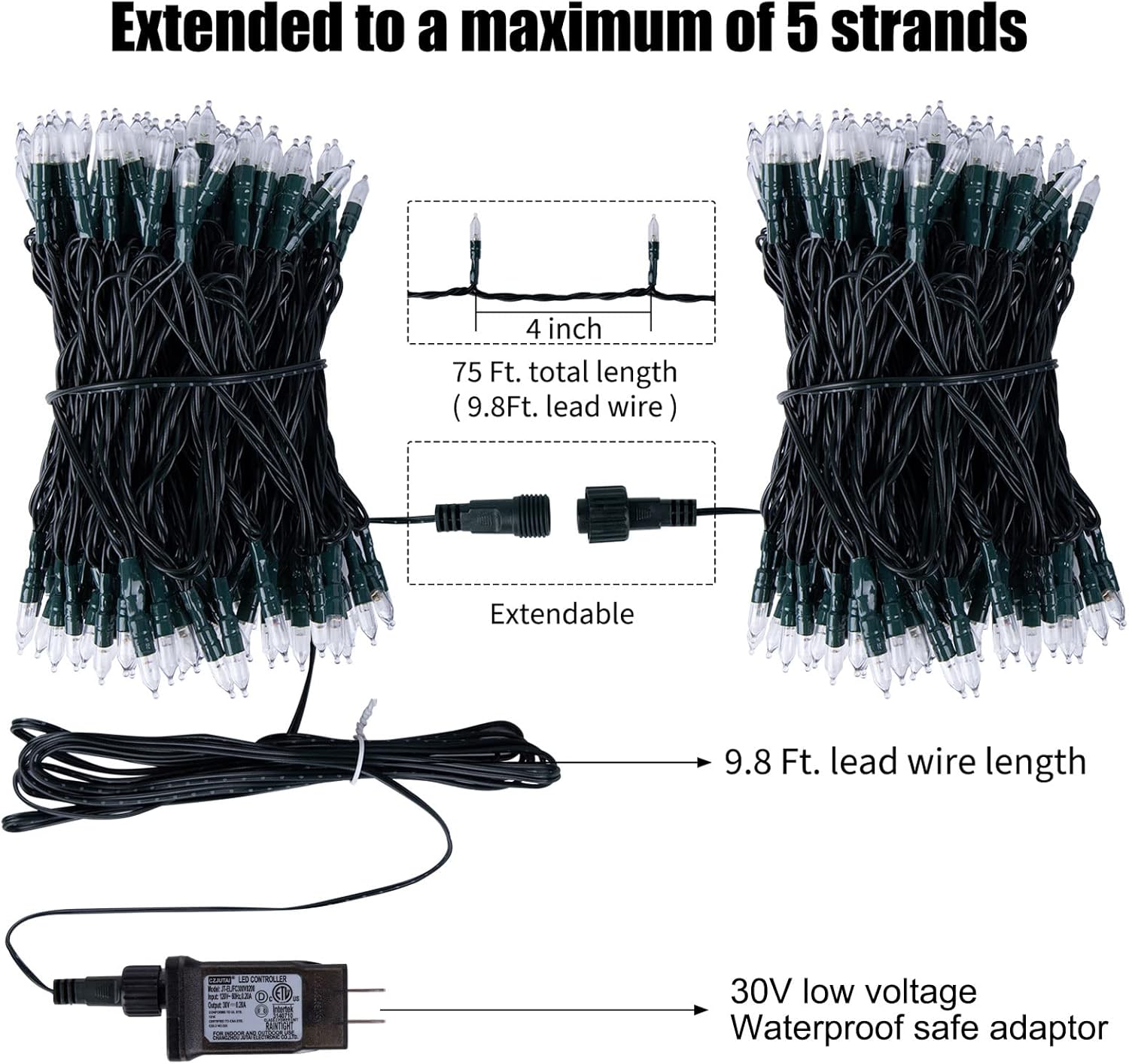 - End Extension: 5 strands connectable makes you get 375 feet 1000 plastic LED string lights to customize your need for large area and festival decorations, creating a grand view of cascading enjoyment. 9.8 inches tail cord with waterproof key designed female connector for speedy connection