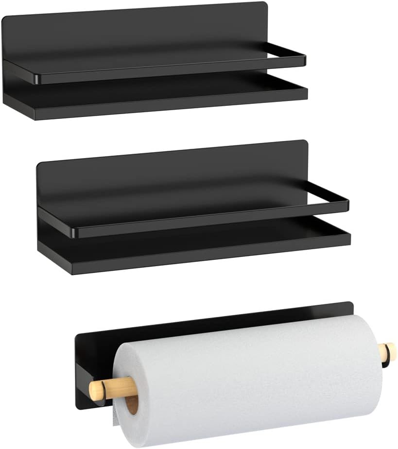 Magnetic Spice Rack Holder Paper Towel Holder with Hook for Refrigerator Fridge Organizer for Kitchen, Space Saver Container for Kitchen/Apartment, Drill Free, Black,3 Packs
