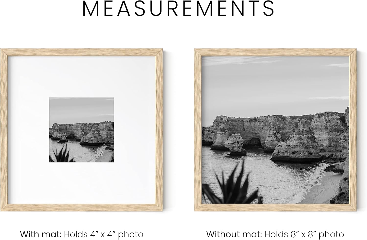 - WOOD PICTURE FRAMES WITH MAT: Our 8 x 8 picture frames for walls are meticulously constructed using natural oak wood, known for its timelessness and durability. The slim profile of the beige multi picture frames effortlessly blends into any interior decor, adding a contemporary touch. The clean lines and sleek design make the square frames 8x8 the perfect choice for those seeking a stylish, understated display solution