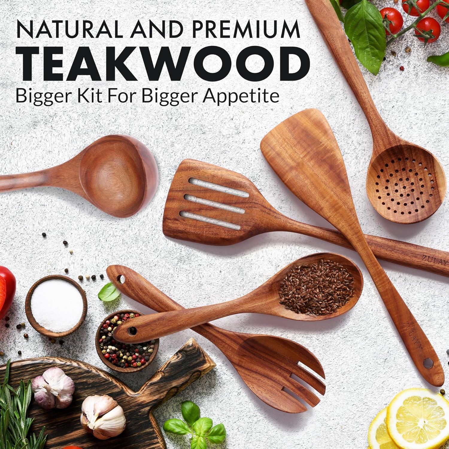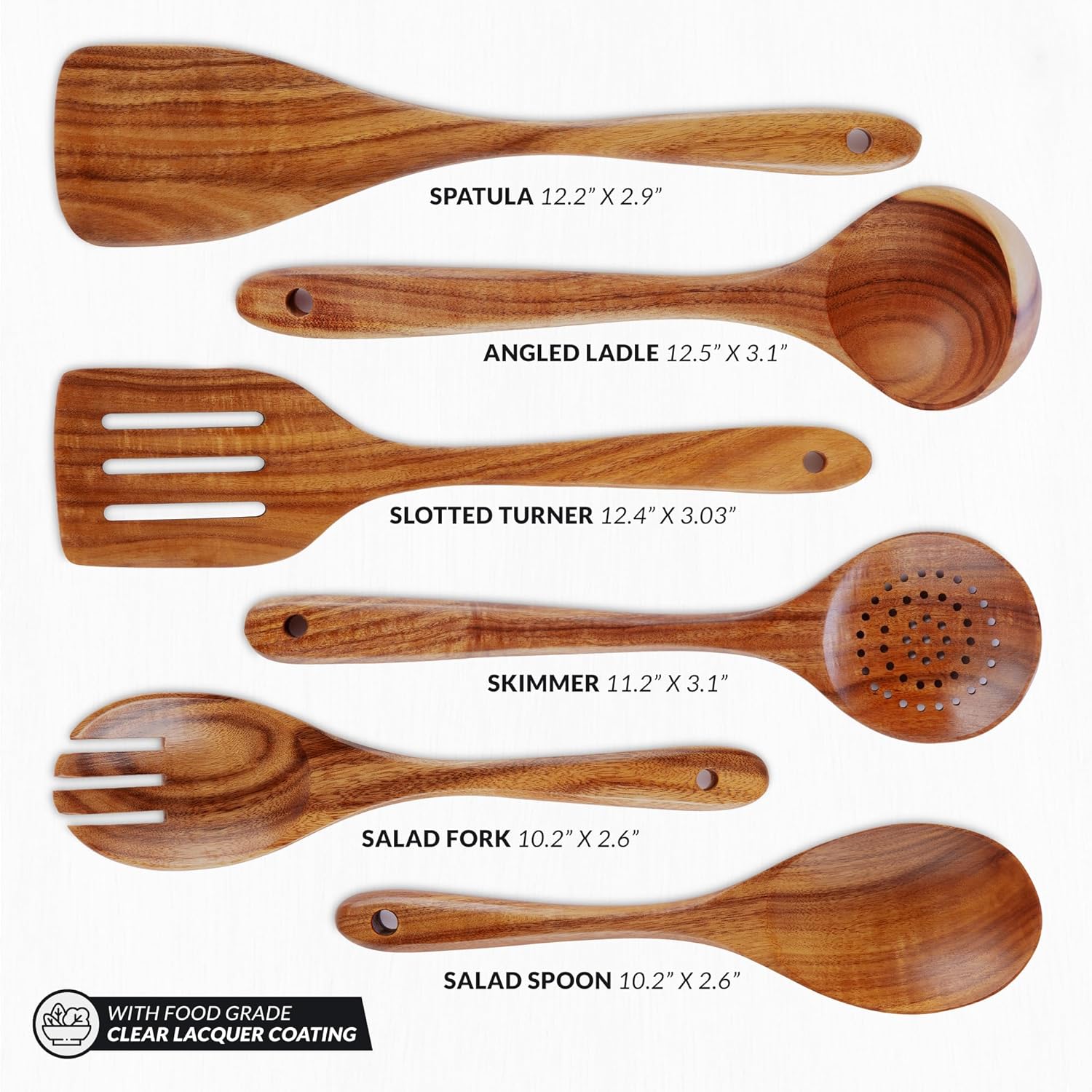 Zulay Kitchen Extra-Large 6-Piece Wooden Spoon Set - Smooth Teak Cooking Utensils - Comfort-Grip Non-Stick Turner, Spatula, Skimmer, Fork, Serving Spoon