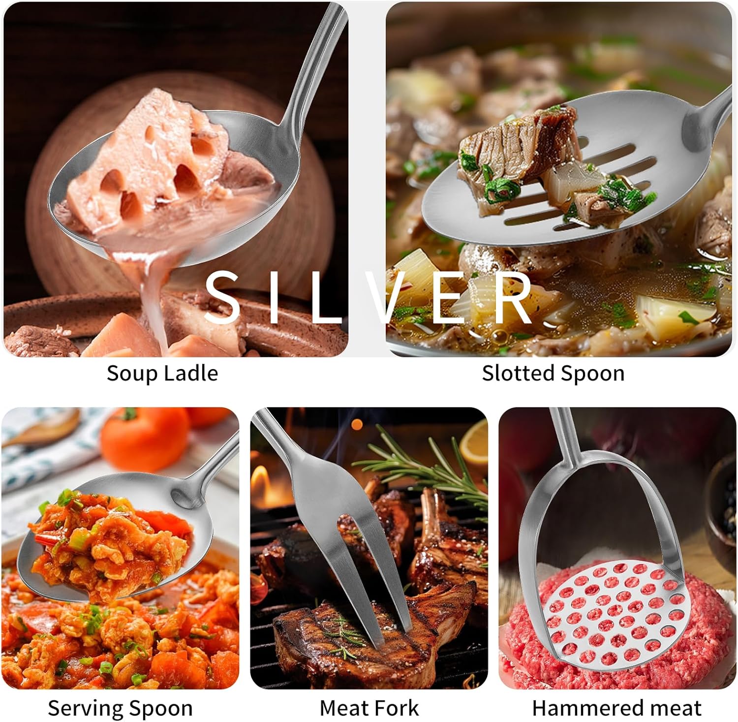 - 12Pcs Kitchen Utensils Set: Lazycorner Utensils Serving Set consists of 1 Soild Turner, 1 Soup Ladle, 1 Slotted Spoon, 1 Slotted Spatula Tunner, 1 Pasta Server, 1 Large Spoon, 1 spaghetti spoon, 1 Serving Spoon, 1 Slotted Spoon, 1 Meat Fork, 2 Serving Tongs. Enhance your cooking experience with 11 kitchen accessories that perfectly for your cooking needs