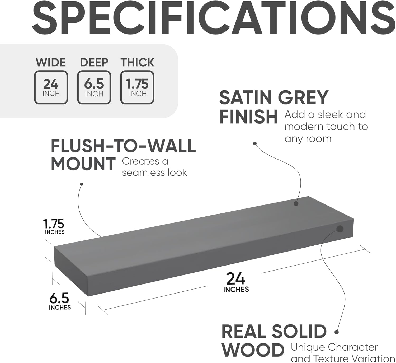 Homeforia 24inch Gray Floating Shelves for Wall, High End Solid Real Wood 24in Floating Shelf for Bathroom, Grey Wooden 24 inch Long Floating Shelves, Heavy Duty Bracket, 24 X 6.5 X 1.75 in, Set of 2