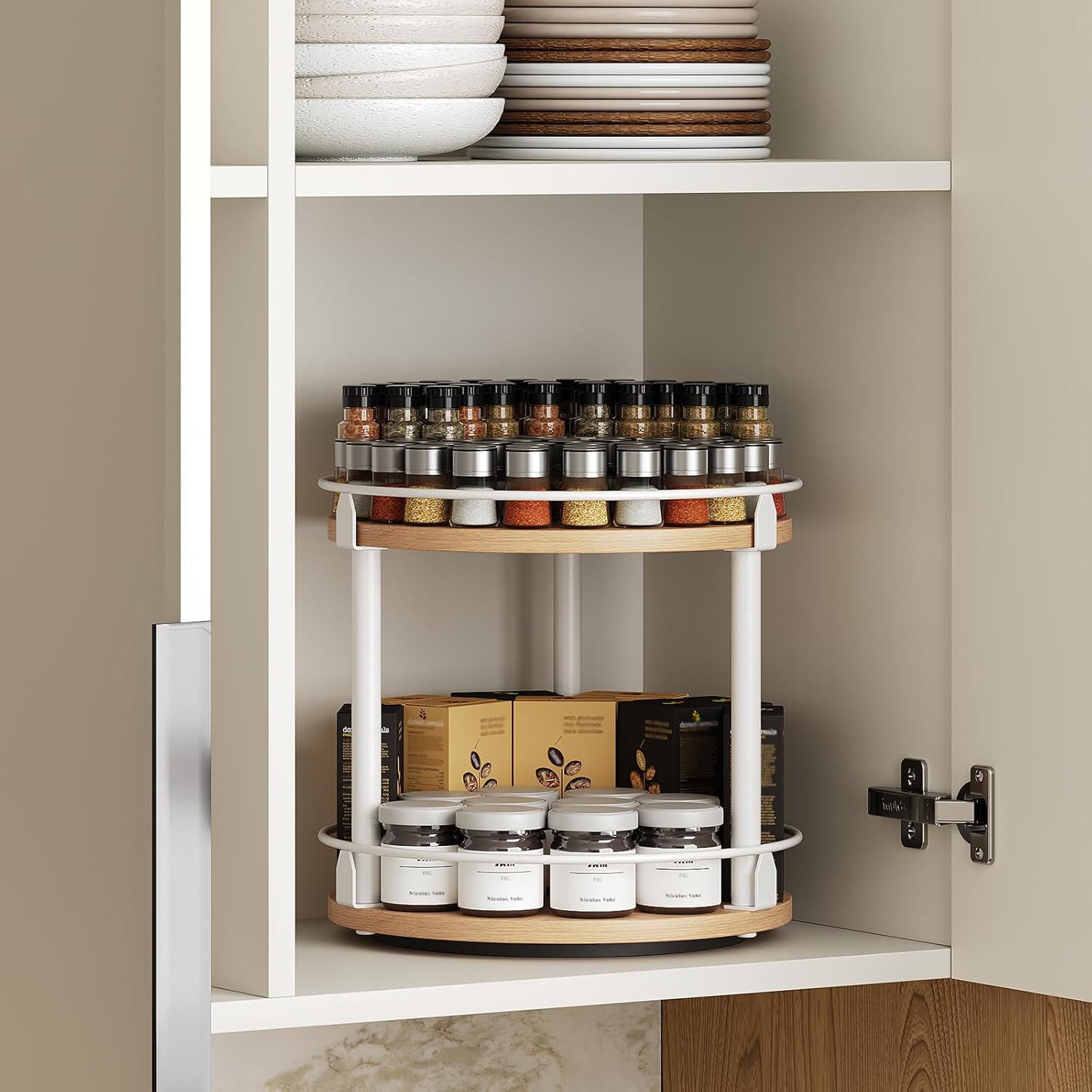 Lazy Susan Organizer, Rotating Spice Rack, 2 Tier Spice Turntable Organizer, Industrial Turntable Spice Holder, for Kitchen Countertop, Compact and Versatile, White and Natural SR22WN