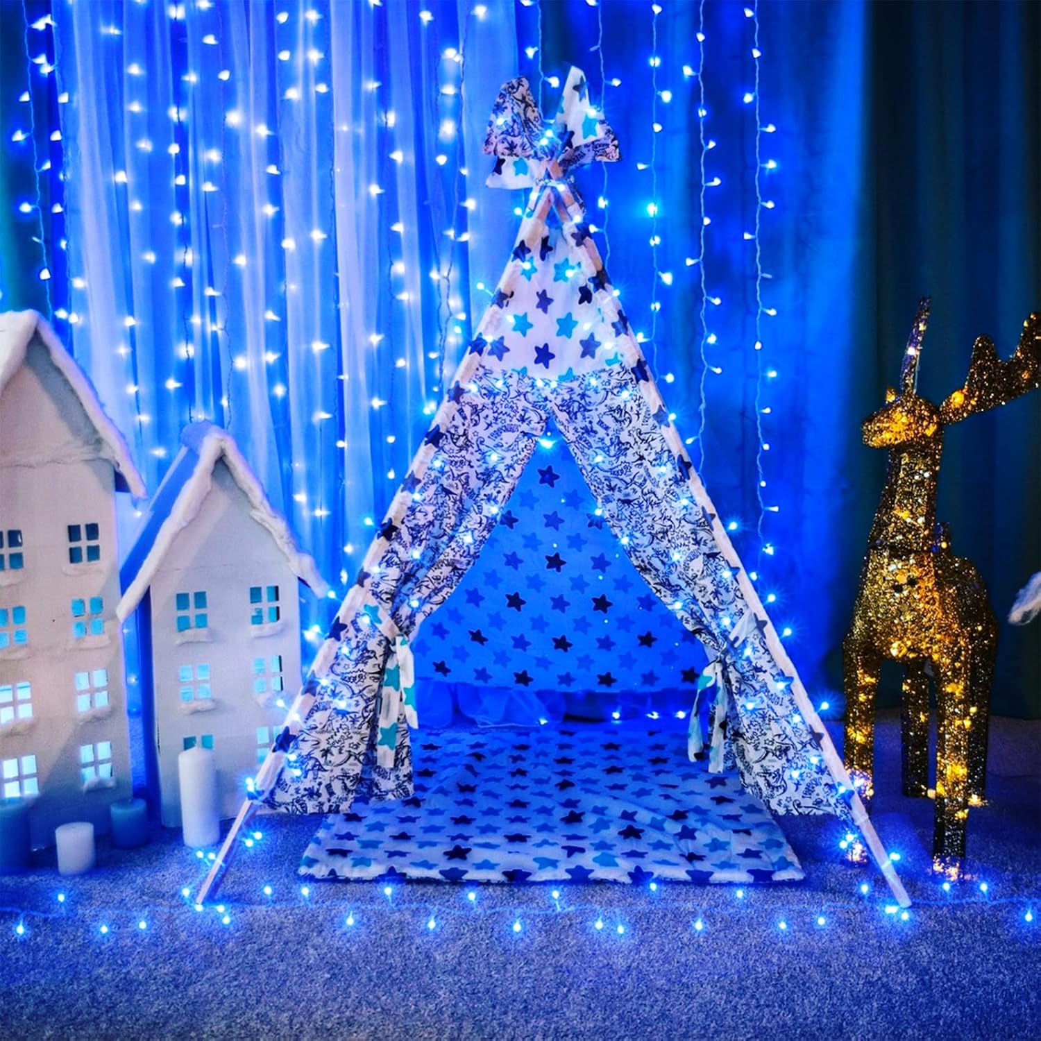 - Blue String Lights Indoor: 400 LED string lights total length is 142 ft, including 132 ft Christmas lights and a 10 ft extension cord. End-to-end connectable Christmas string lights can connect up to 3 strings for your decorative needs. The connecting string lights can be controlled by one controller.
