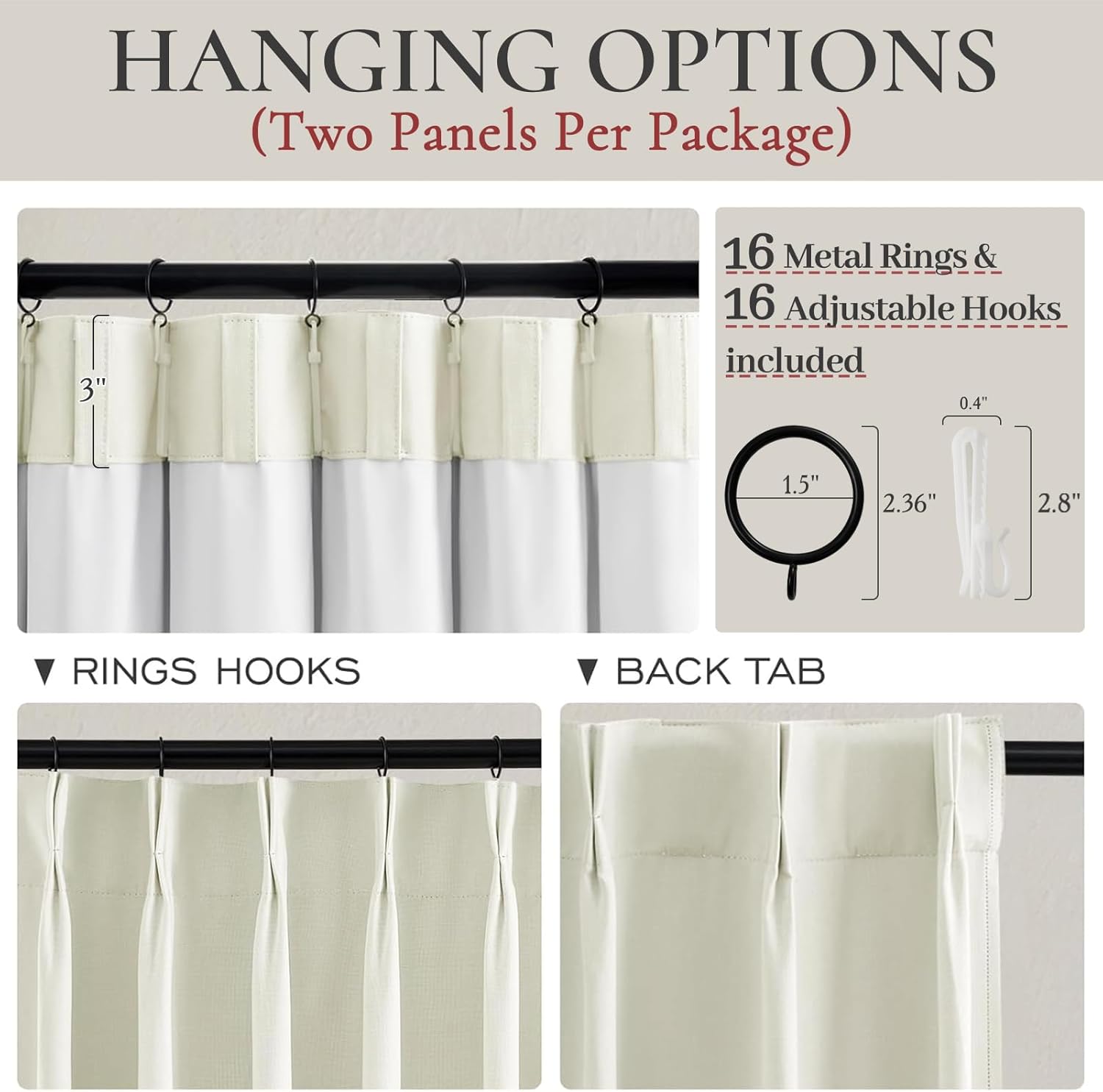- Ready Made:Set of 2 pinch pleated curtain panels per package with 16 metal rings and 16 adjustable plastic hooks(The adjustable hook can raise and lower the height of the curtain by 1 inch),Each panel measures 40"W x 102"L,pair measures 80"W x 102"L