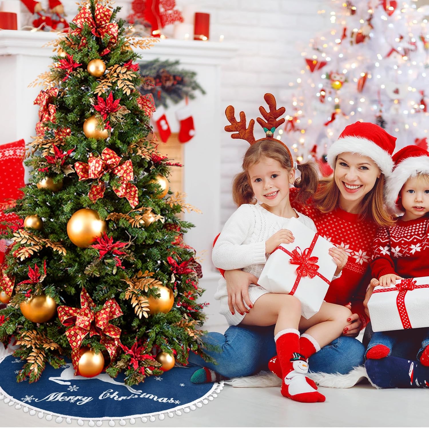 - Merry Christmas Tree Skirts:Our xmas tree skirt is printed with elk and various sizes of snow patterns, as well as the words "Merry Christmas." The edges are adorned with small, fluffy balls, adding a festive touch to your Christmas tree. This 24-inch tree skirt is perfectly sized for most Christmas trees perfectly. Before making a purchase, please measure the diameter of your tree to ensure a perfect fit