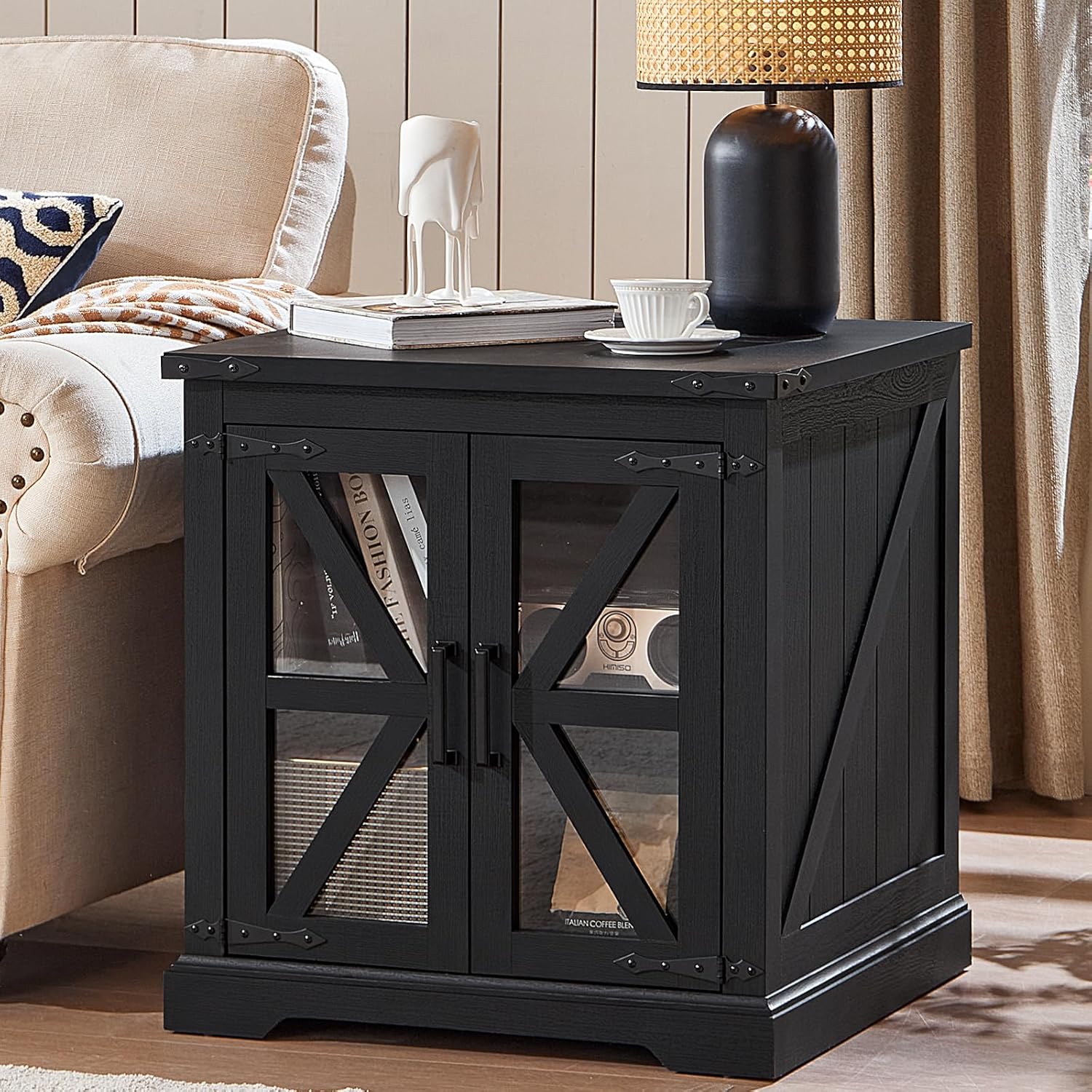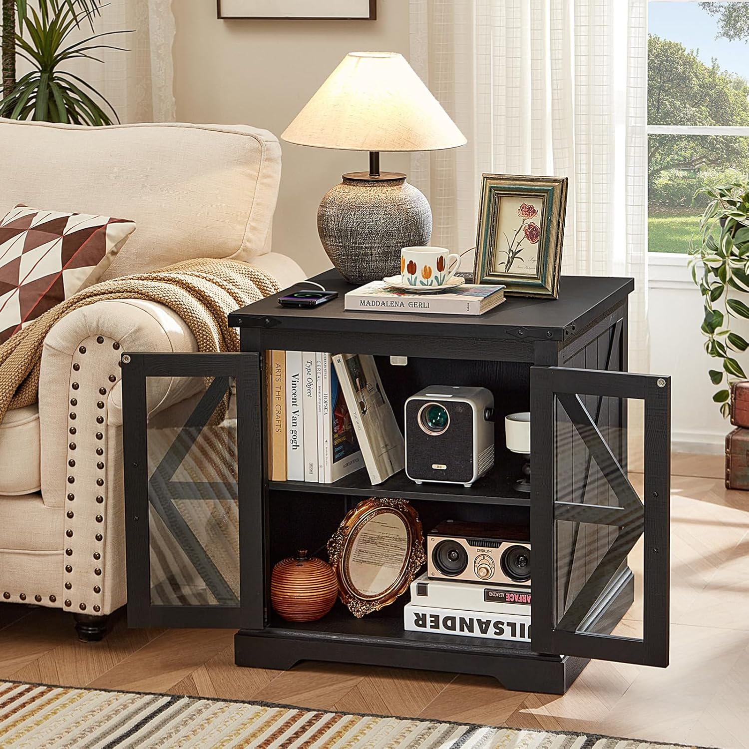- π‘[Farmhouse-Style end Table with Charging Station]This large end tables with generous storage is a perfect fusion of farmhouse and industrial metal styles. The exquisite barn-style tempered glass doors and the black metal corner accents add an elegant touch to the cabinet body, making it visually captivating from any angle.