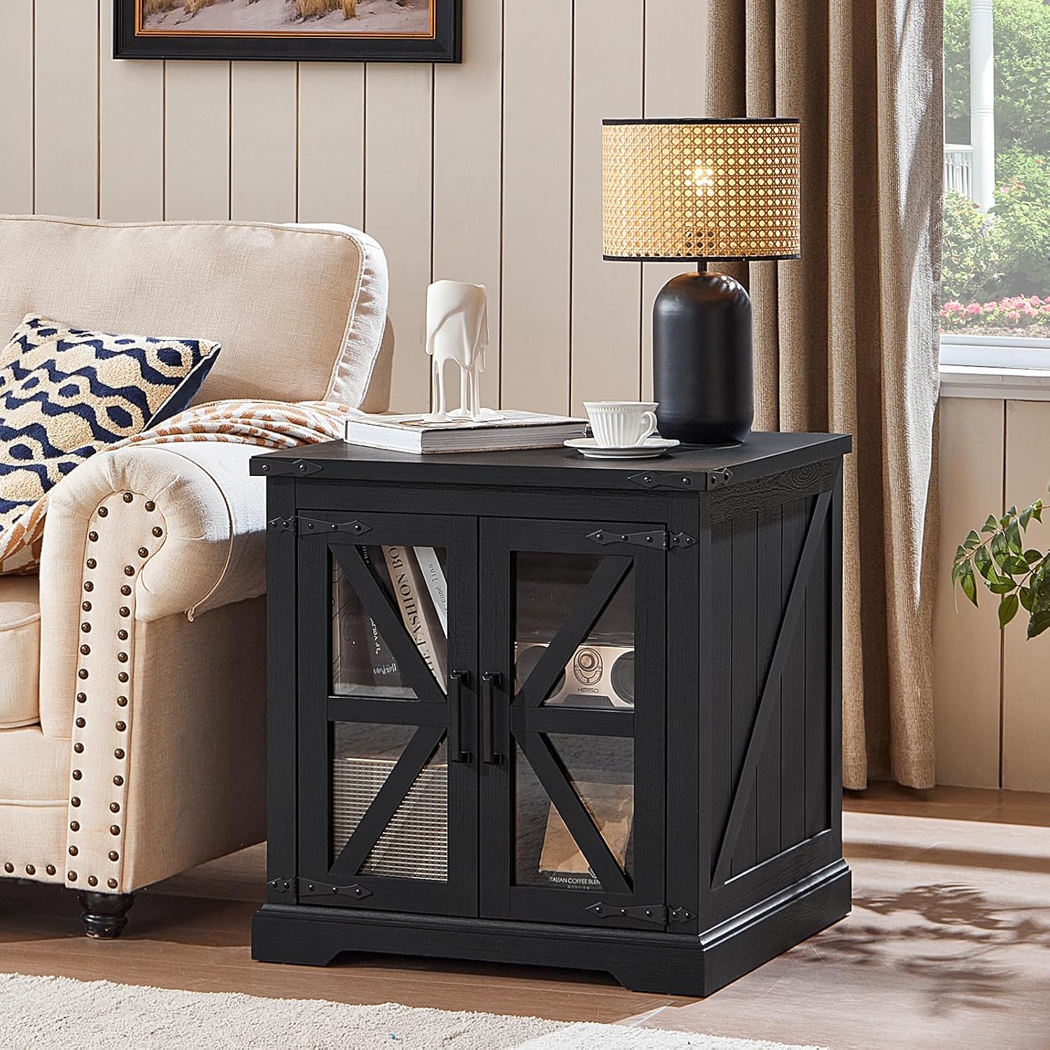 - π‘[Farmhouse-Style end Table with Charging Station]This large end tables with generous storage is a perfect fusion of farmhouse and industrial metal styles. The exquisite barn-style tempered glass doors and the black metal corner accents add an elegant touch to the cabinet body, making it visually captivating from any angle.
