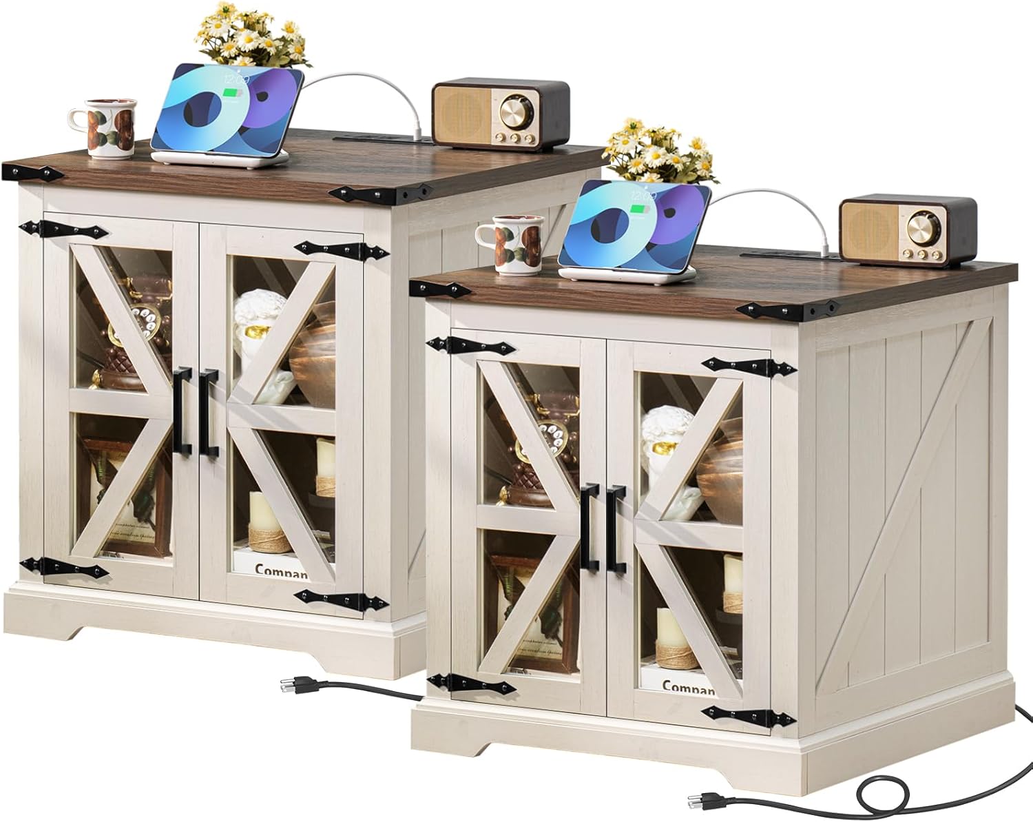- π‘[Farmhouse-Style end Table with Charging Station]This large end tables with generous storage is a perfect fusion of farmhouse and industrial metal styles. The exquisite barn-style tempered glass doors and the black metal corner accents add an elegant touch to the cabinet body, making it visually captivating from any angle.