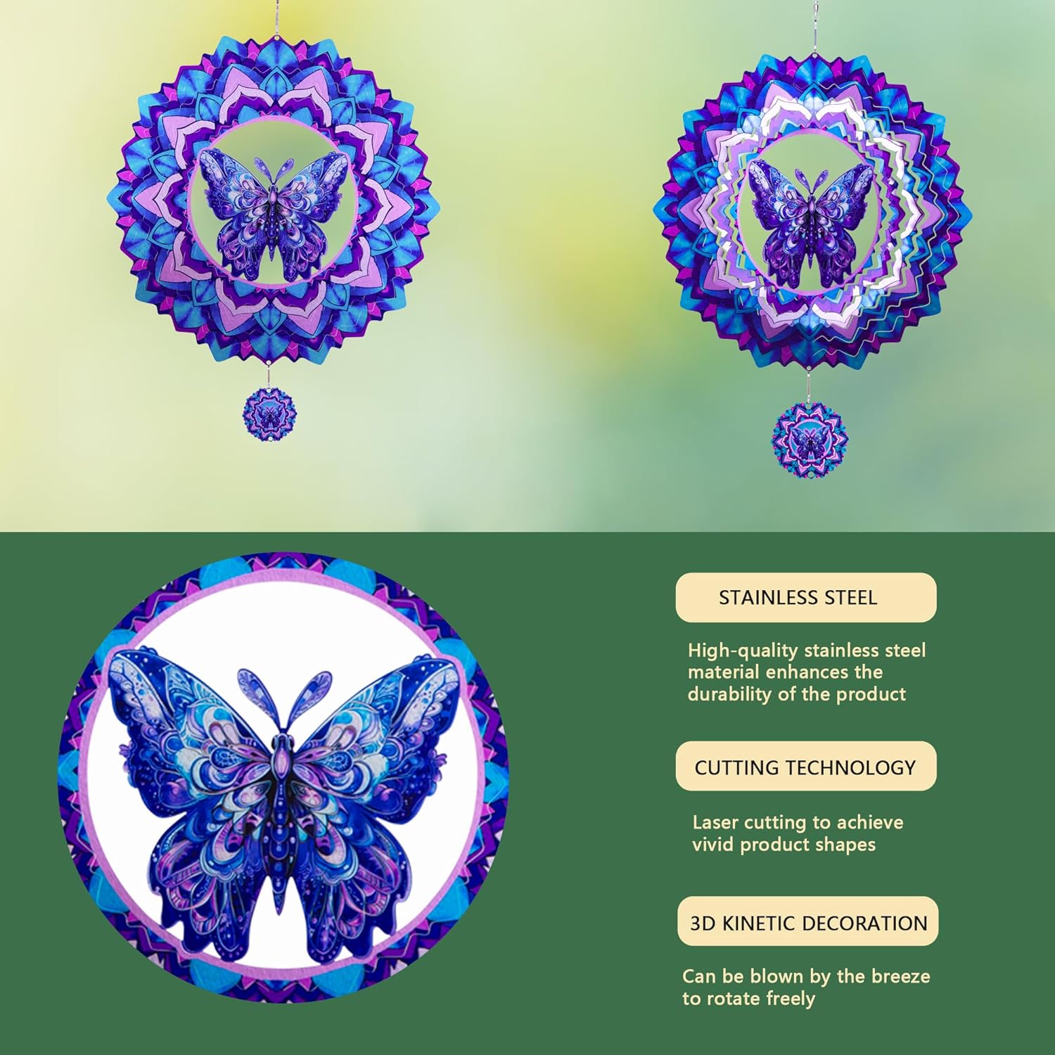 - 【Product introduction】: This 3D wind spinner is made of 12 inches and made of high-quality stainless steel. which adopts cutting technology and PUV printing to achieve a vivid butterfly shape.