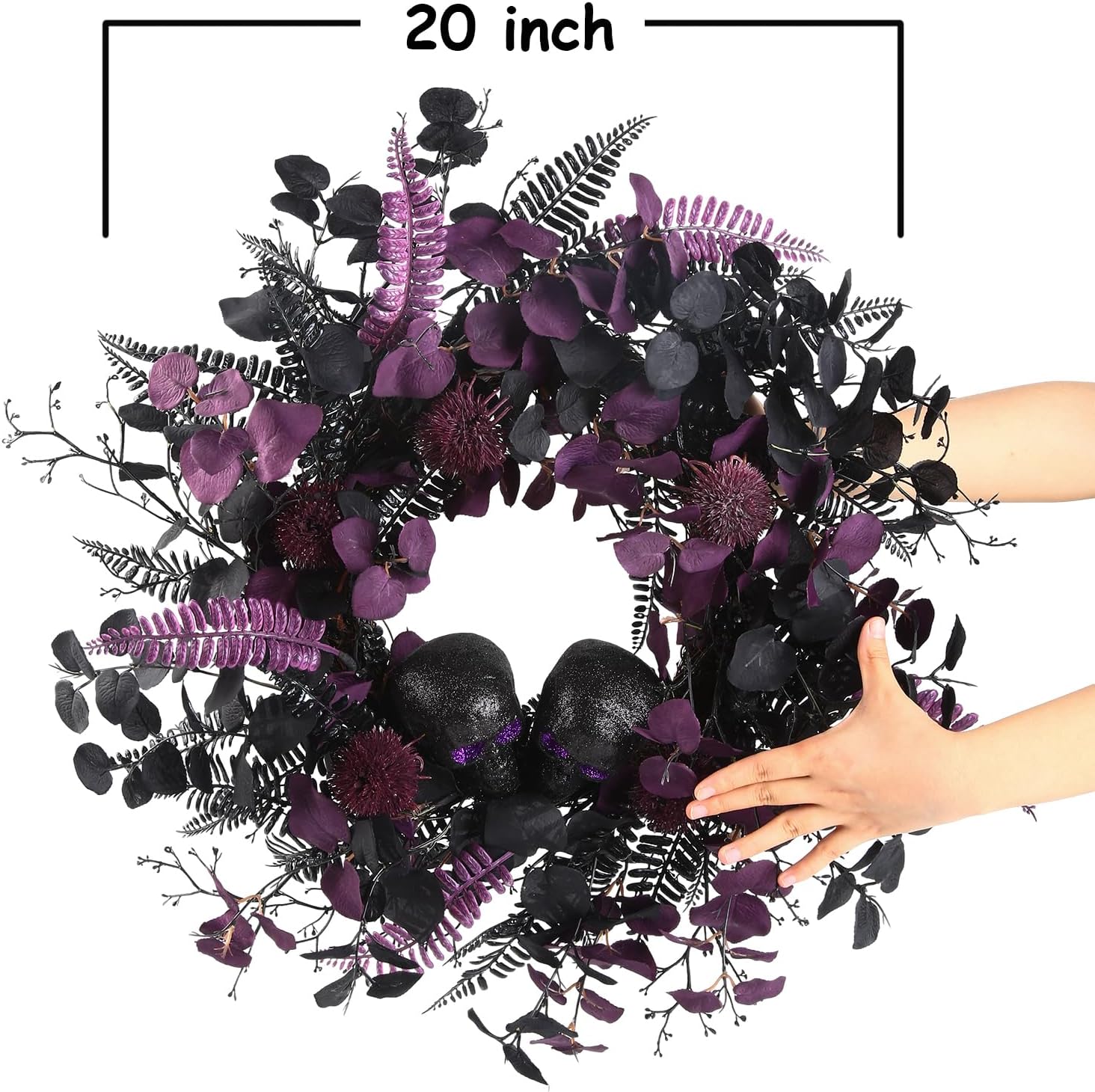 20" Halloween Wreaths for Front Door, Black Glitter Skulls Purple Eucalyptus Leaves Halloween Horror Decor, Gothic Party Room Decoration