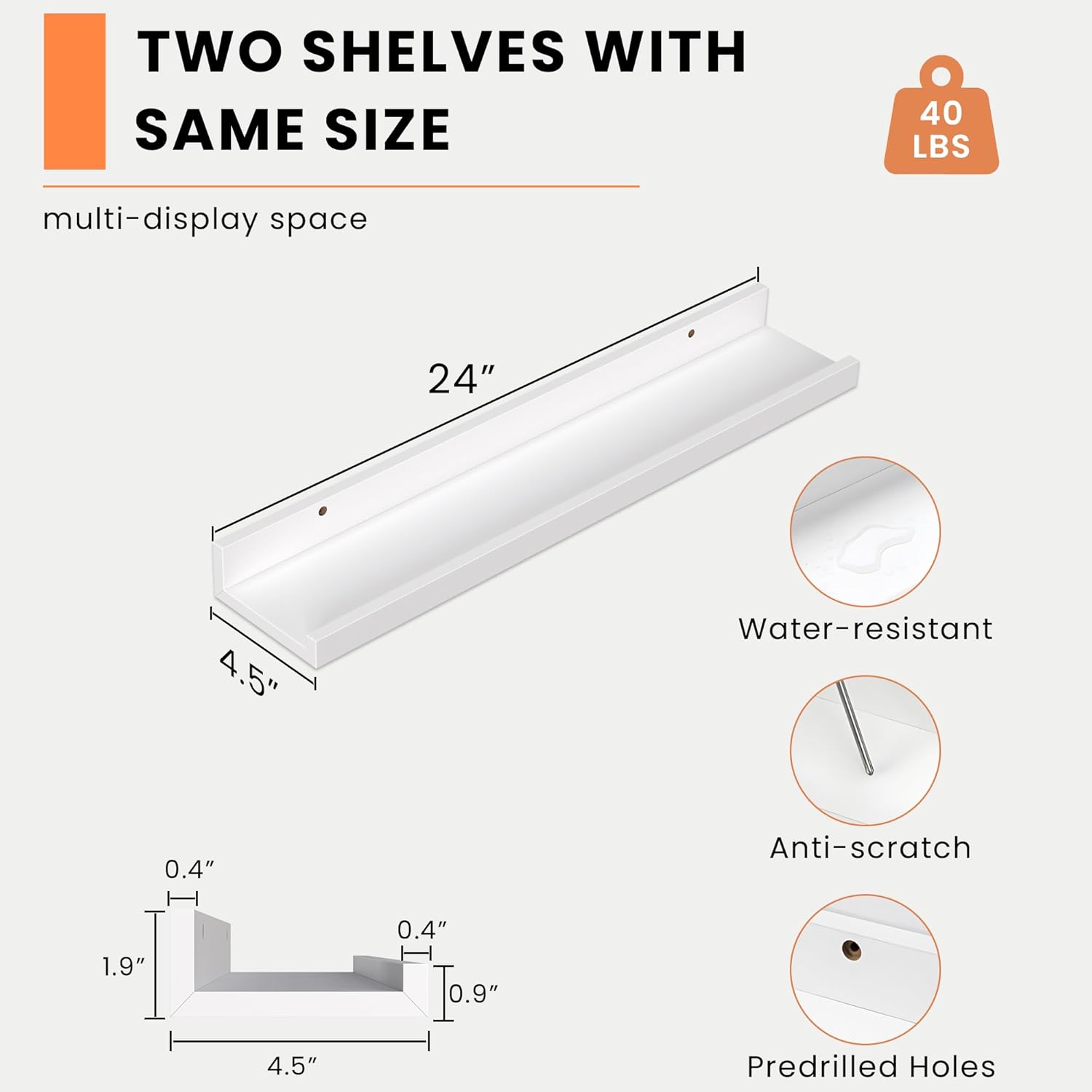 Heimlove Picture Ledge Shelf, Floating Shelves Set of 2, 24 Inches Picture Shelf for Wall with Ledge, Kids Bookshelf Wall Mounted for Living Room Bedroom Decor Books Photo Frames - White
