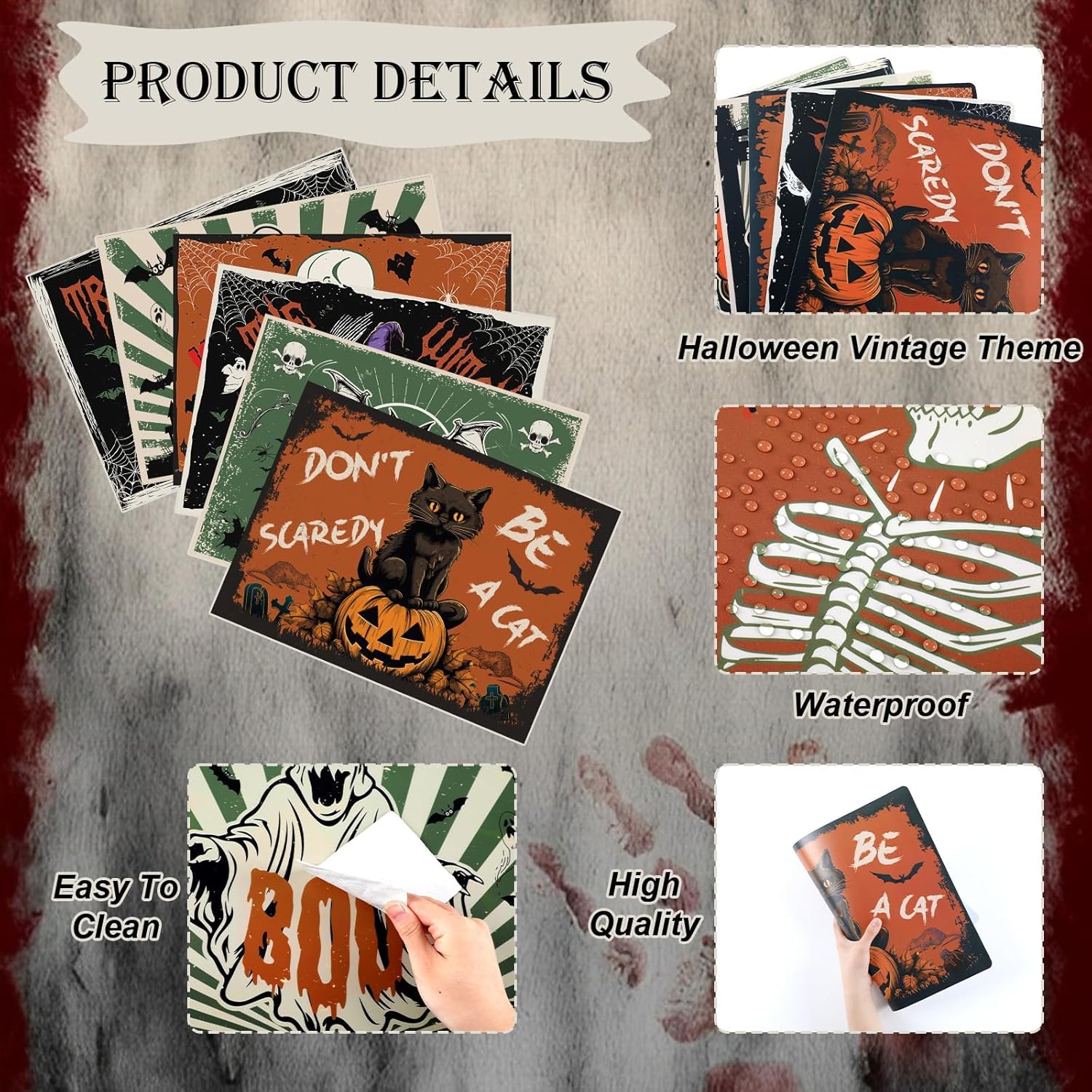 Halloween Placemats Set of 6 Vintage Plastic Table Mats Black Cat Place Mats Washable Ghost Witch Bat Rectangle Skull Table Decoration for Indoor Outdoor Party Kitchen Dining