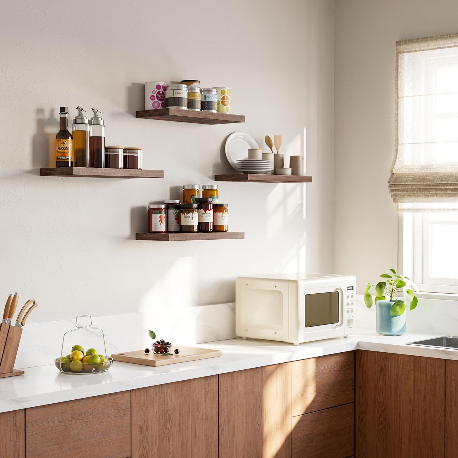 - Set of 4--This set includes four floating shelves, allowing you to create a cohesive look throughout your home. Use them all together or spread them out across different rooms for a coordinated and organized space.
