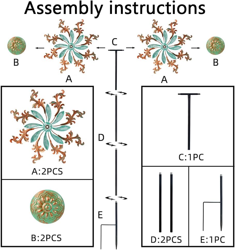 - The components of the outdoor wind spinner are very easy to install, just need to screw the metal rods and cap, then you can insert it into the ground to decorate your outdoor areas