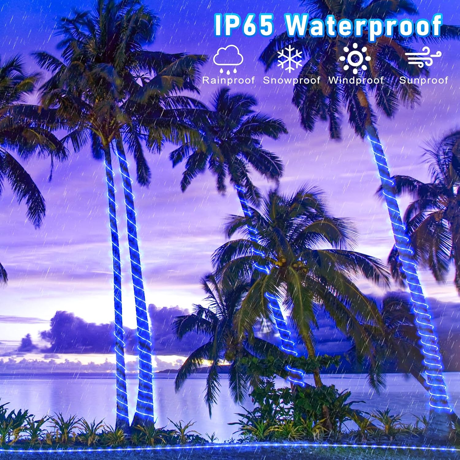 - Waterproof Outdoor String Lights: IP65 Waterproof, they are suitable for all weather use, remaining bright and sparkling even during strong rain and windy days. The outdoor rope lights is ideal for year-round outdoor decor and can illuminate gazebos, canopy, corridors, gardens, and patios. But please note the plug is not waterproof.