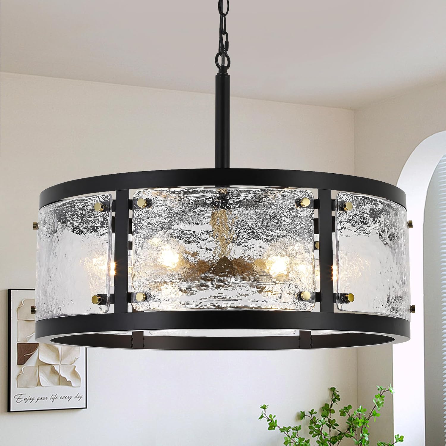 - Design: Large drum chandelier is meticulously crafted by highly skilled craftsmen. The black metal frame is combined with clear waterglass to create a unique texture and depth. Gold accents add a touch of luxury, while the overall circular design provides an even and welcoming lighting effect. The clear waterglass will produce a unique light and shadow effect when the light penetrates, adding a unique charm to the interior.