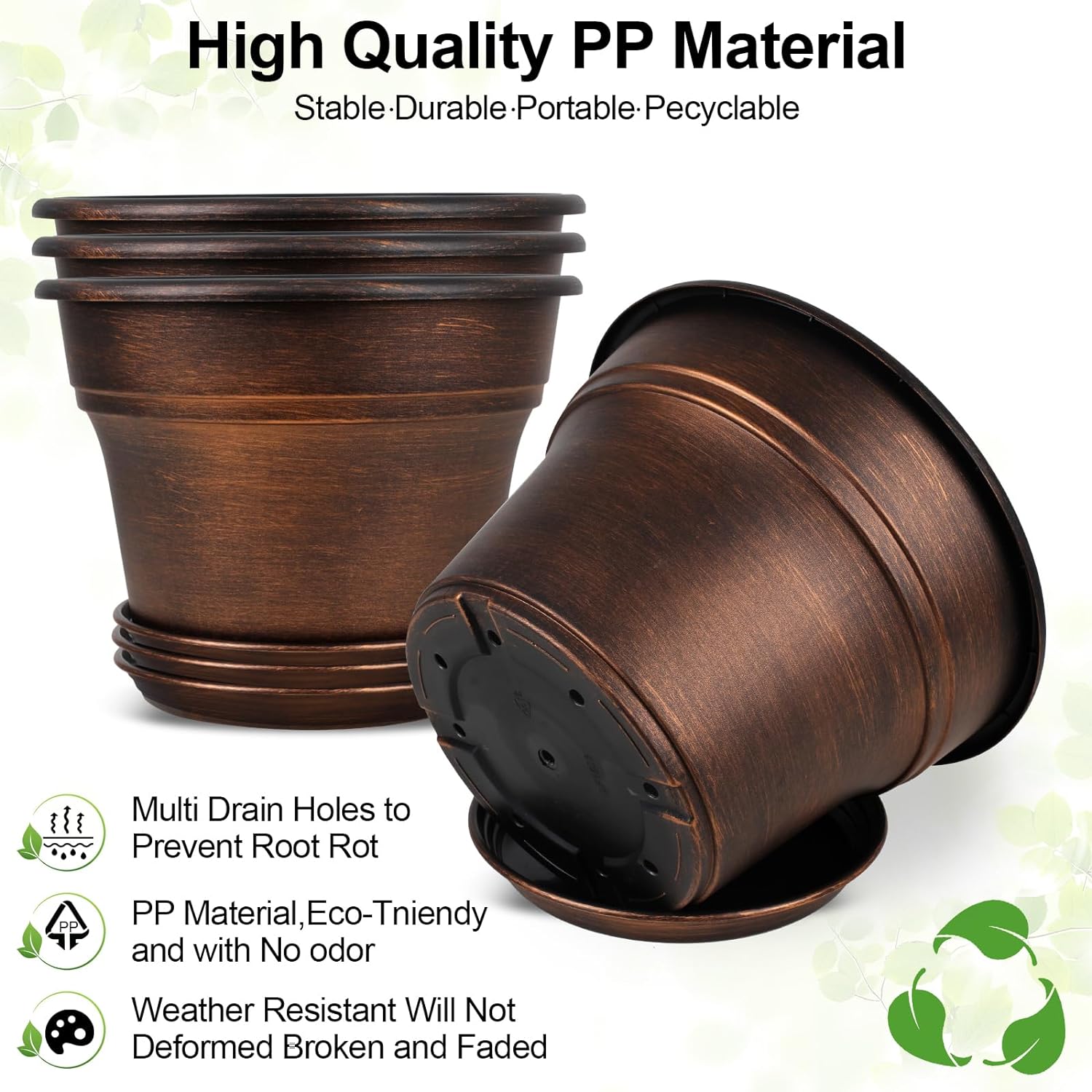 10 Inch Planters Plant Pots Indoor Outdoor, 4 Pack Plastic Flower Pot for Indoor Plants with Drainage Holes & Trays, Resin Decorative Container Sets with Saucer for House Garden Copper
