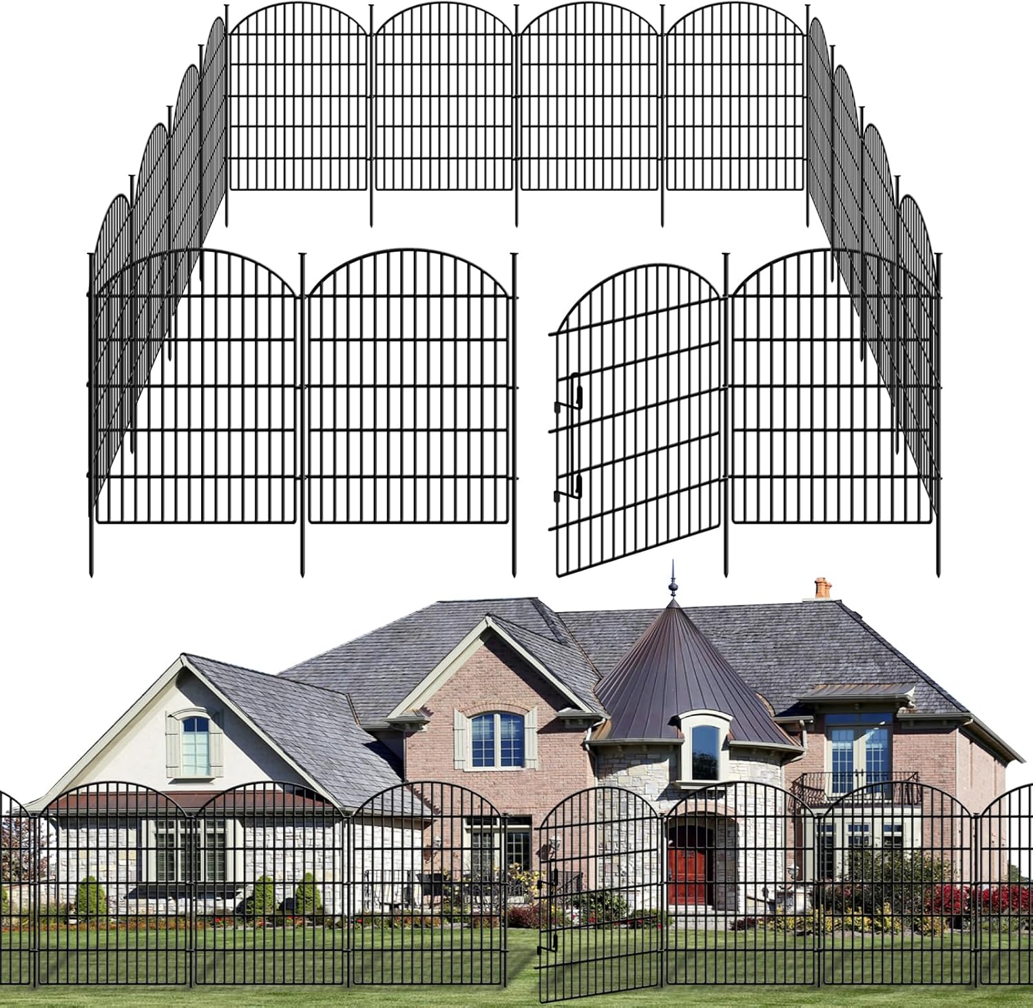 - MORE AVAILABLE SIZE: The classic arch shape design garden fence single piece measures 26.77" wide, 40" high, 1.5" gap. Comes with 11 metal stakes are 44" in height, which can be inserted into about 12.6 inches above the ground, making it strong enough to prevent animals from entering & leaving, dog digging, and even keep rabbits away from your plants. A total of 10 fence panels with a lock, connecting 11 fence stakes, the total length of the garden fence is approximately 21.92 ft.