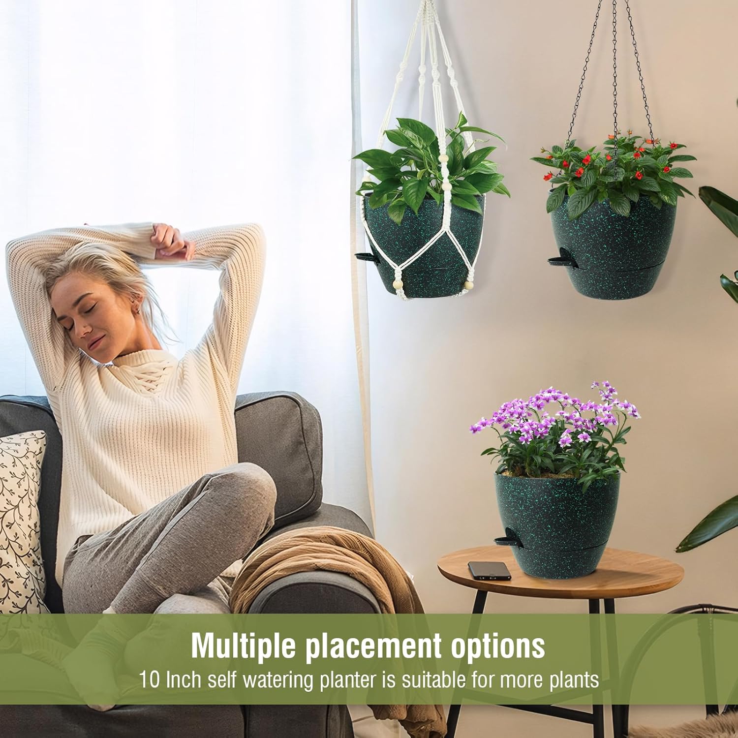 10 inch Self Watering Hanging Planters, 2 Pack Hanging Flower Pots for Indoor Outdoor Plants, Hanging Baskets with Drainage Holes & 2 Kinds of Plant Hangers for Home Decor, Speckled Black