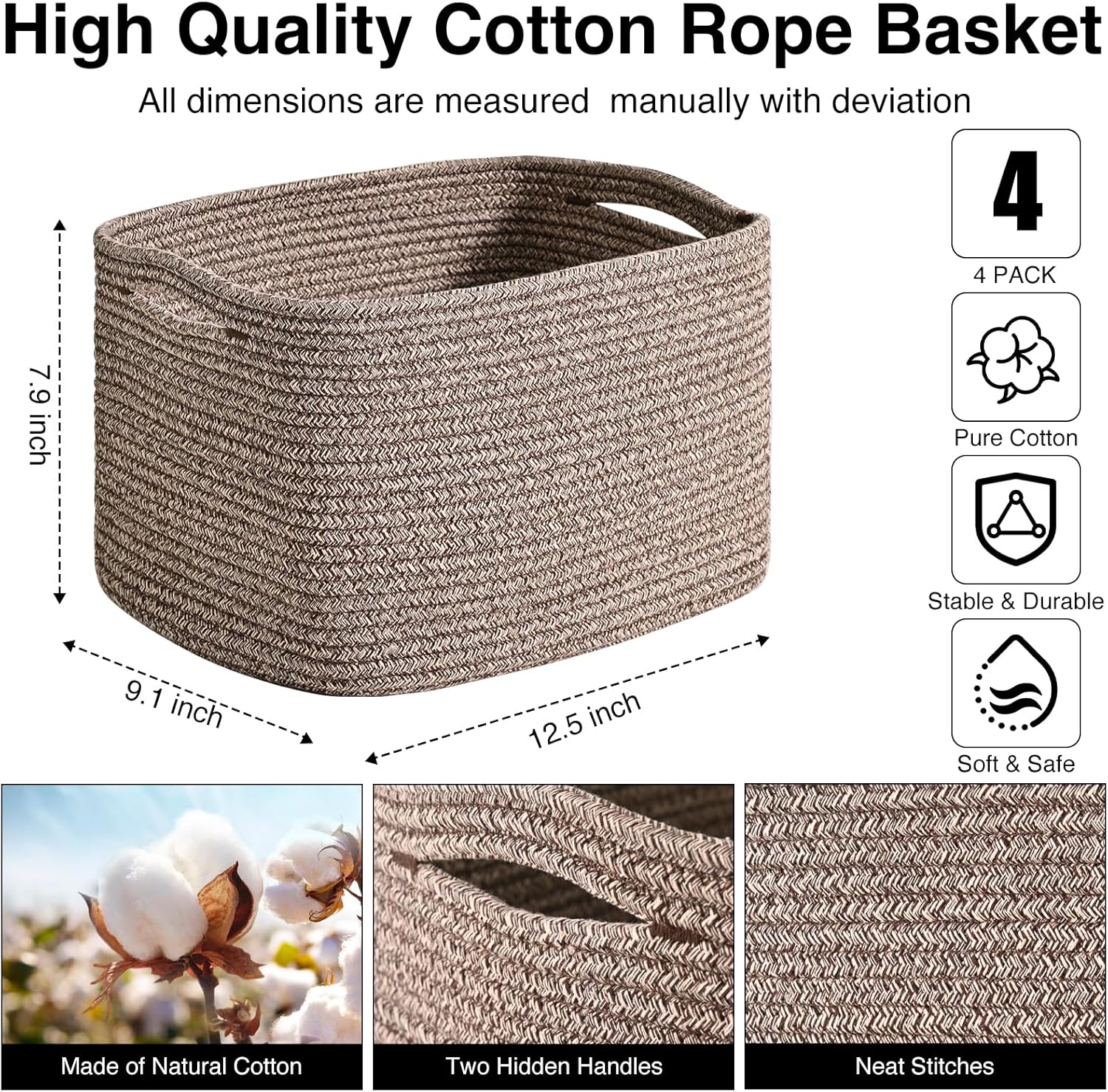 Storage Baskets for Shelves Organizing, Woven Cotton Rope Baskets for Storage, Book Basket, Decorative Shelf Basket, 12.5"Lx9.1''Wx7.9''H (4 Packs) Dark Brown