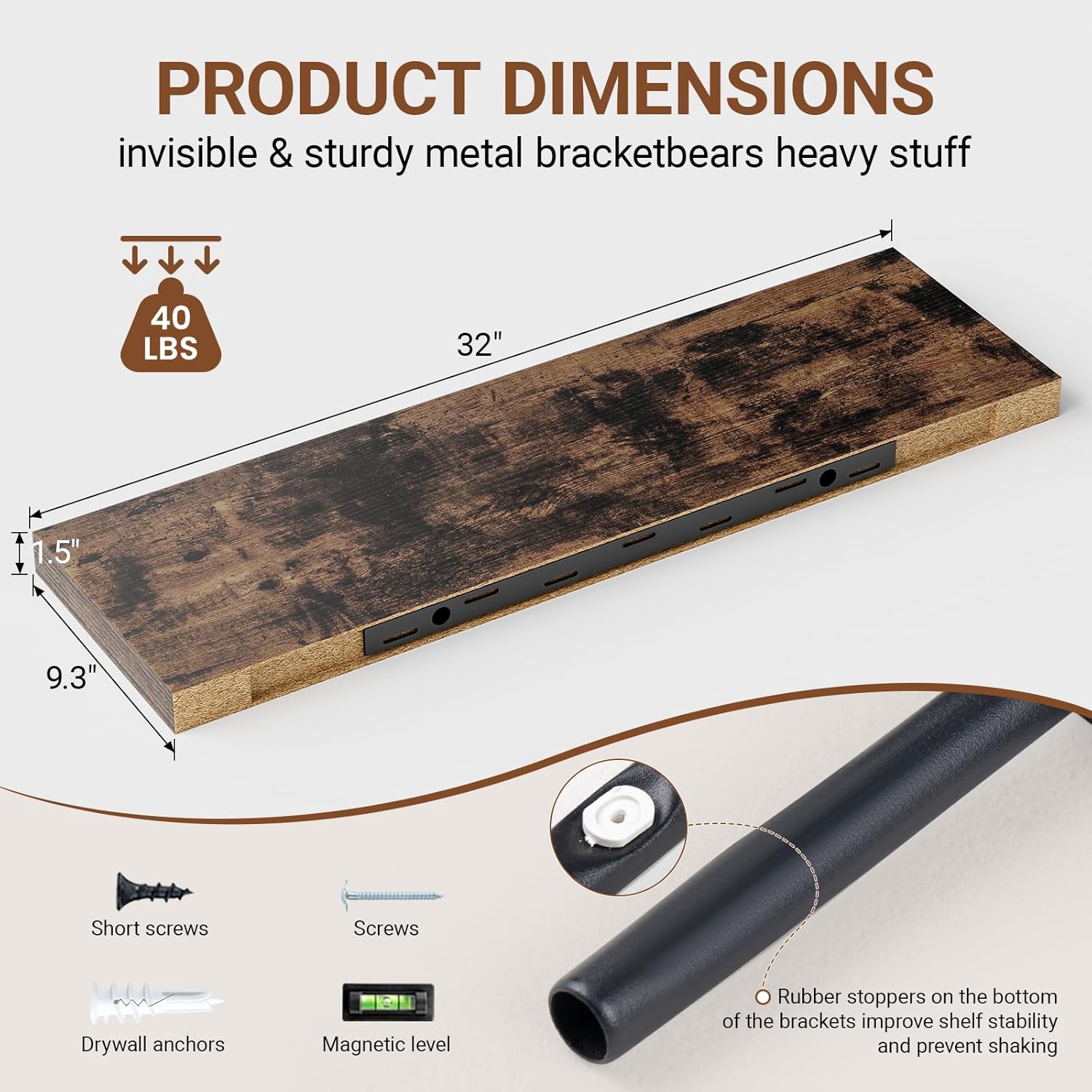 - ăLonger DesignăOur pretty rustic brown floating shelves are 32"W x 9.3"D x 1.5"H.Our 32 floating shelves is longer than traditional designs and can hold more items.The brown floating shelves optimize wall space,helping organize essentials without taking up floor space in your home.