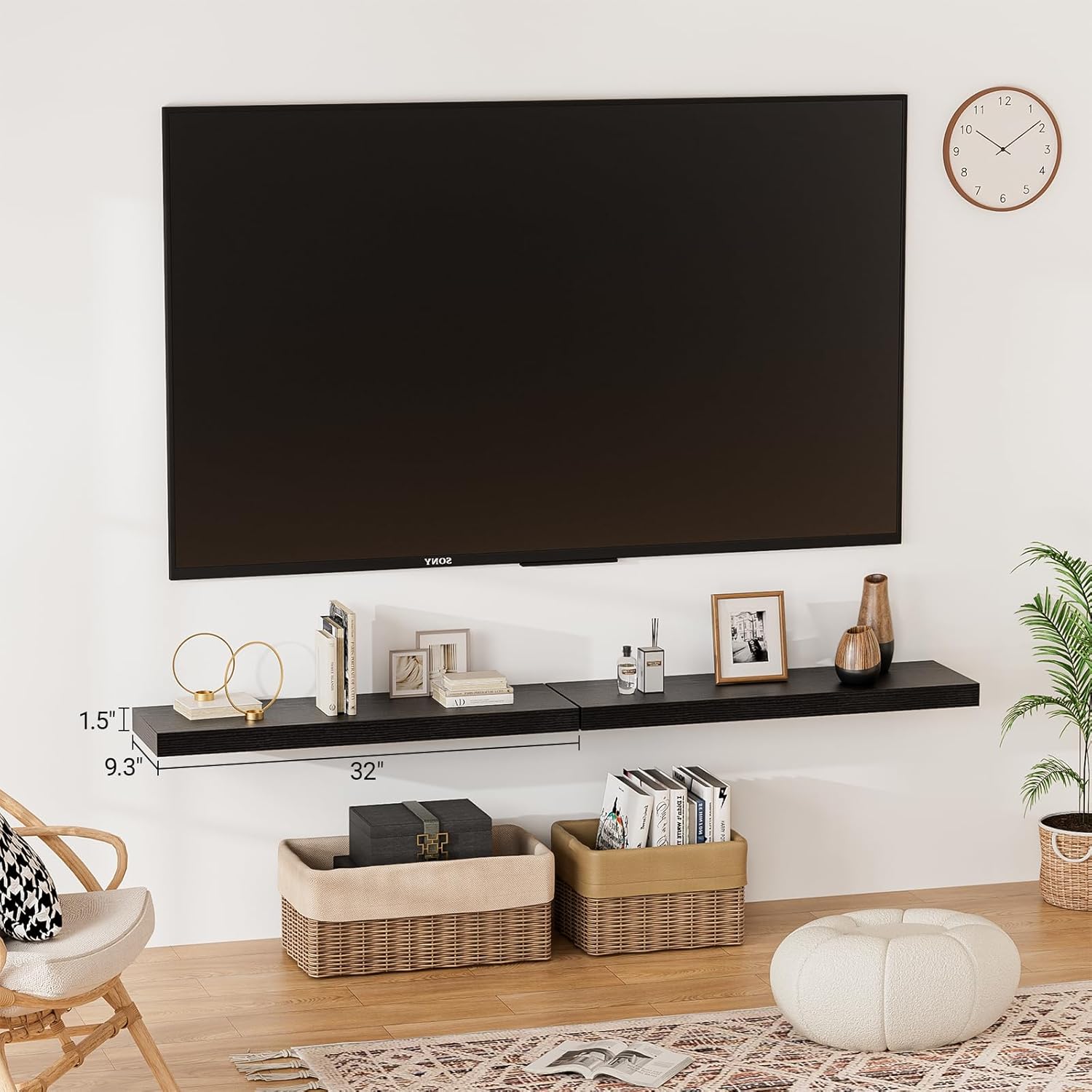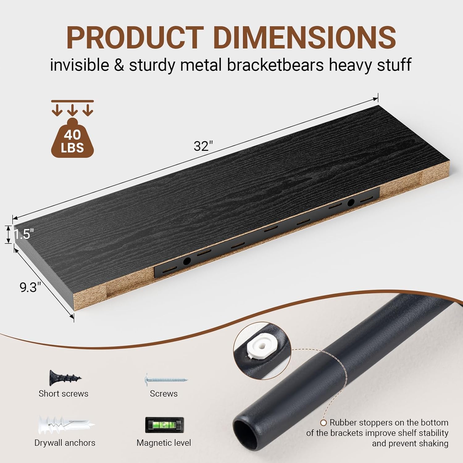 - ăLonger DesignăOur pretty 32 inch black wall shelves are 32"W x 9.3"D x 1.5"H.Our 32 floating shelves is longer than traditional designs and can hold more items.The black floating shelf optimize wall space,helping organize essentials without taking up floor space in your home.