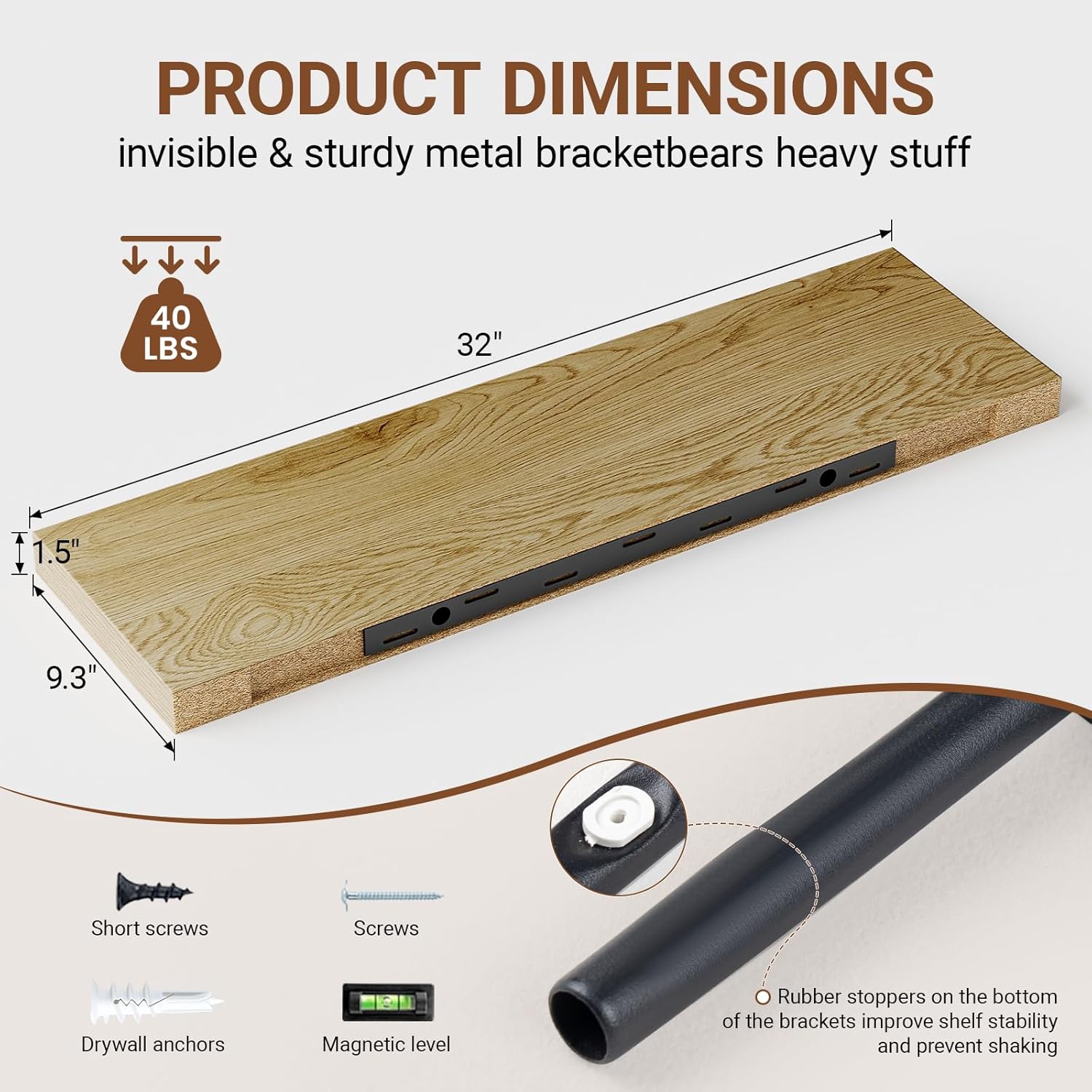 - ăSturdy & Reliable MaterialăThe floating shelves for wall 32 inches long use metal brackets and screws to be firmly fixed to the wall without sagging.Our oak floating shelves are made of high quality MDF material,can hold up to 40 lbs to safely place your items.