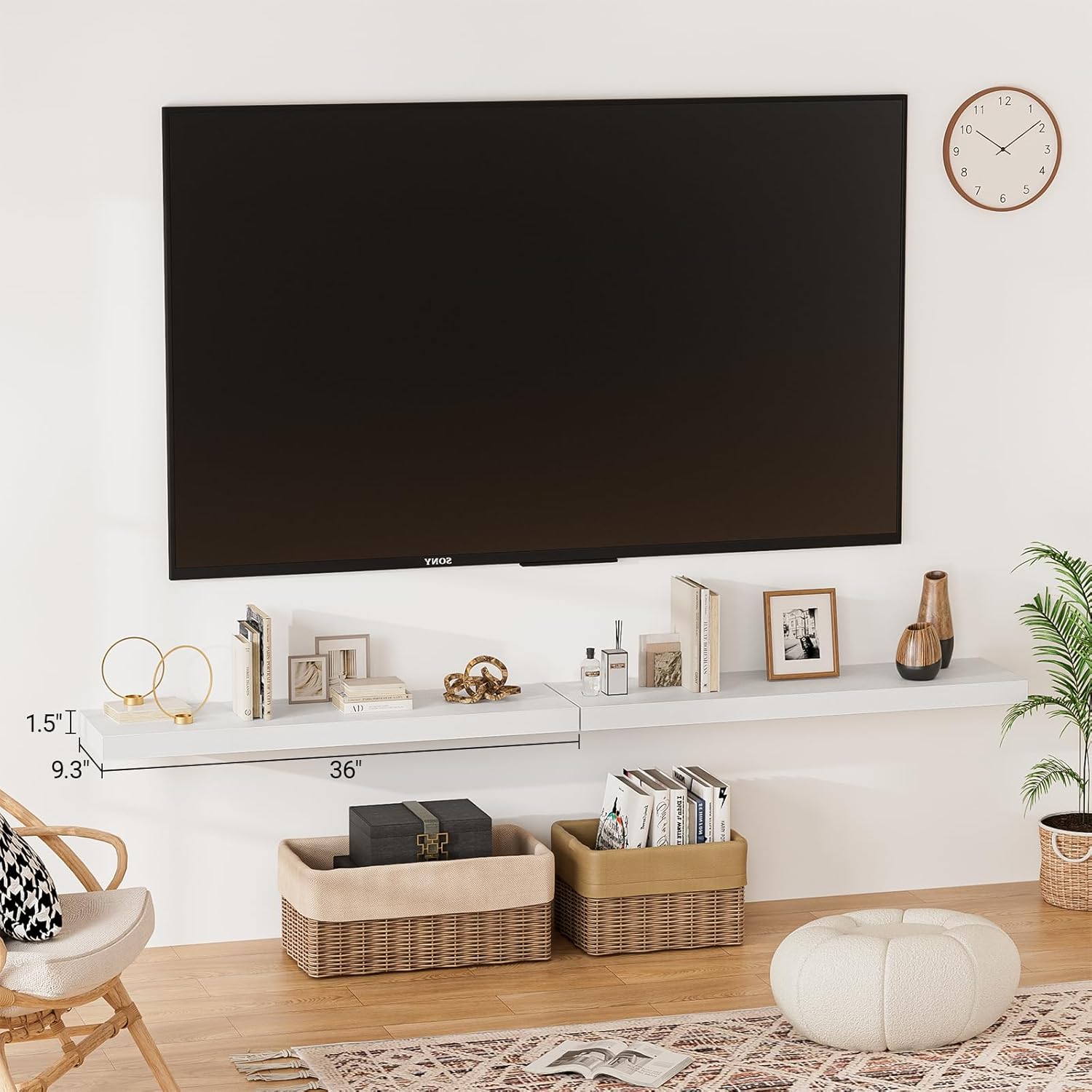 - ăLonger DesignăOur pretty 36 inch wall shelves are 36"W x 9.3"D x 1.5"H.Our white floating shelves is longer than traditional designs and can hold more items.The 36 inch white floating shelf optimize wall space,helping organize essentials without taking up floor space in your home.