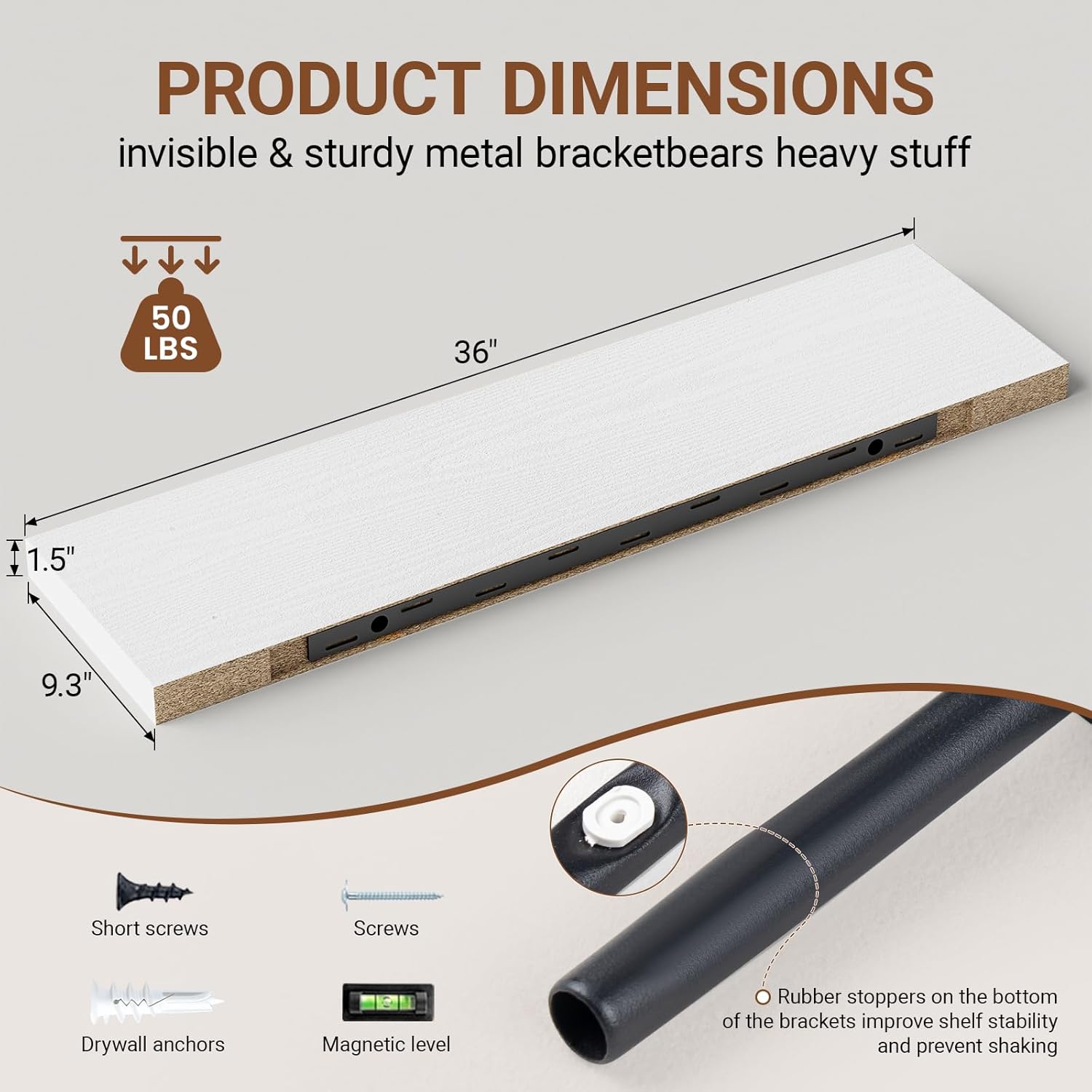 - ăSturdy & Reliable MaterialăThe 36 Floating shelf for wall use metal brackets and screws to be firmly fixed to the wall without sagging.Our floating shelves 36 inch are made of high quality MDF material,can hold up to 50 lbs to safely place your items.