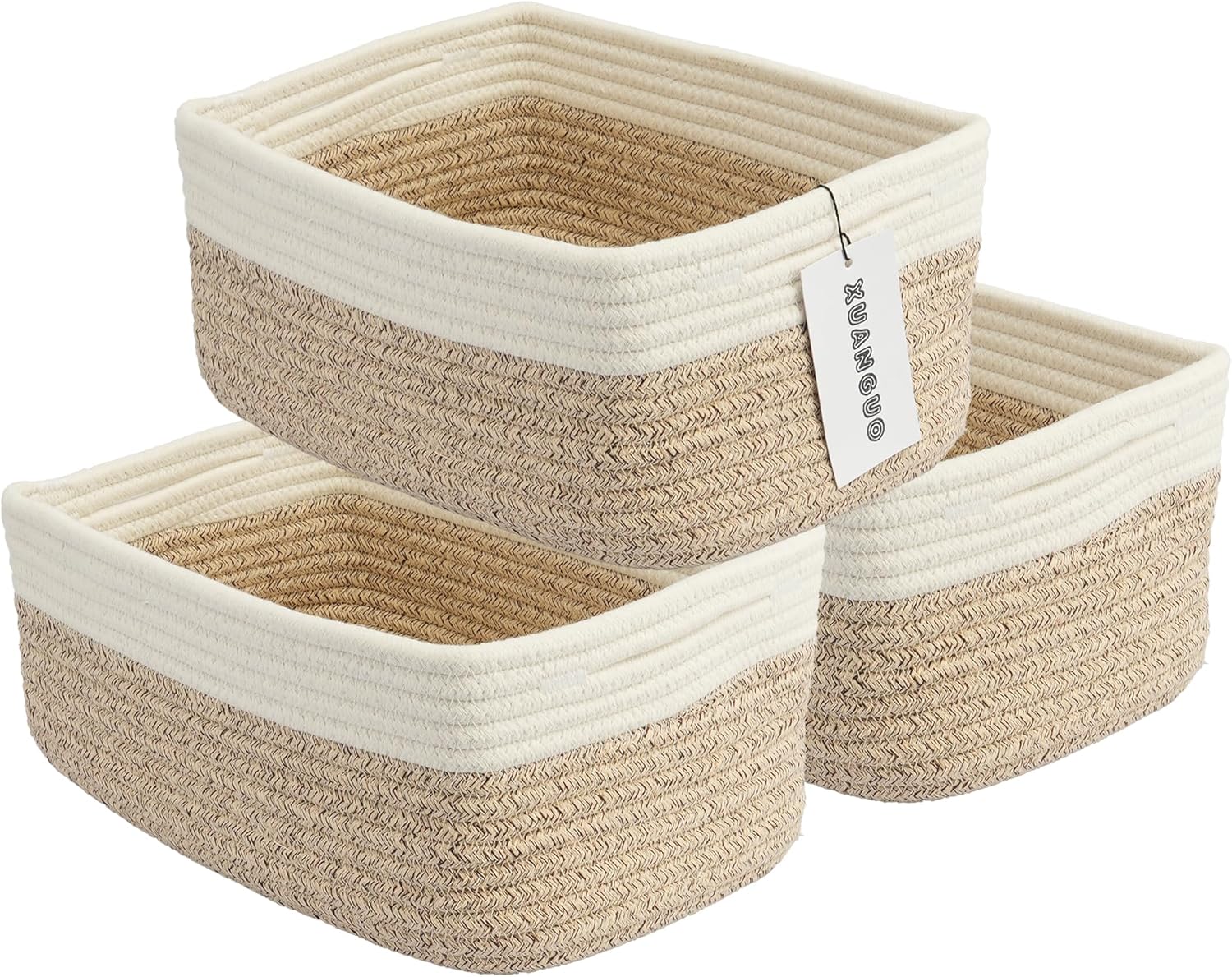 Small Woven Storage Baskets 12“X8”X5“ Decorative Rope Bins for Organizing Shelves, Closets, and Toys, Empty Gift Baskets, Cute Organizer Basket for Home and Office (white and brown regular)
