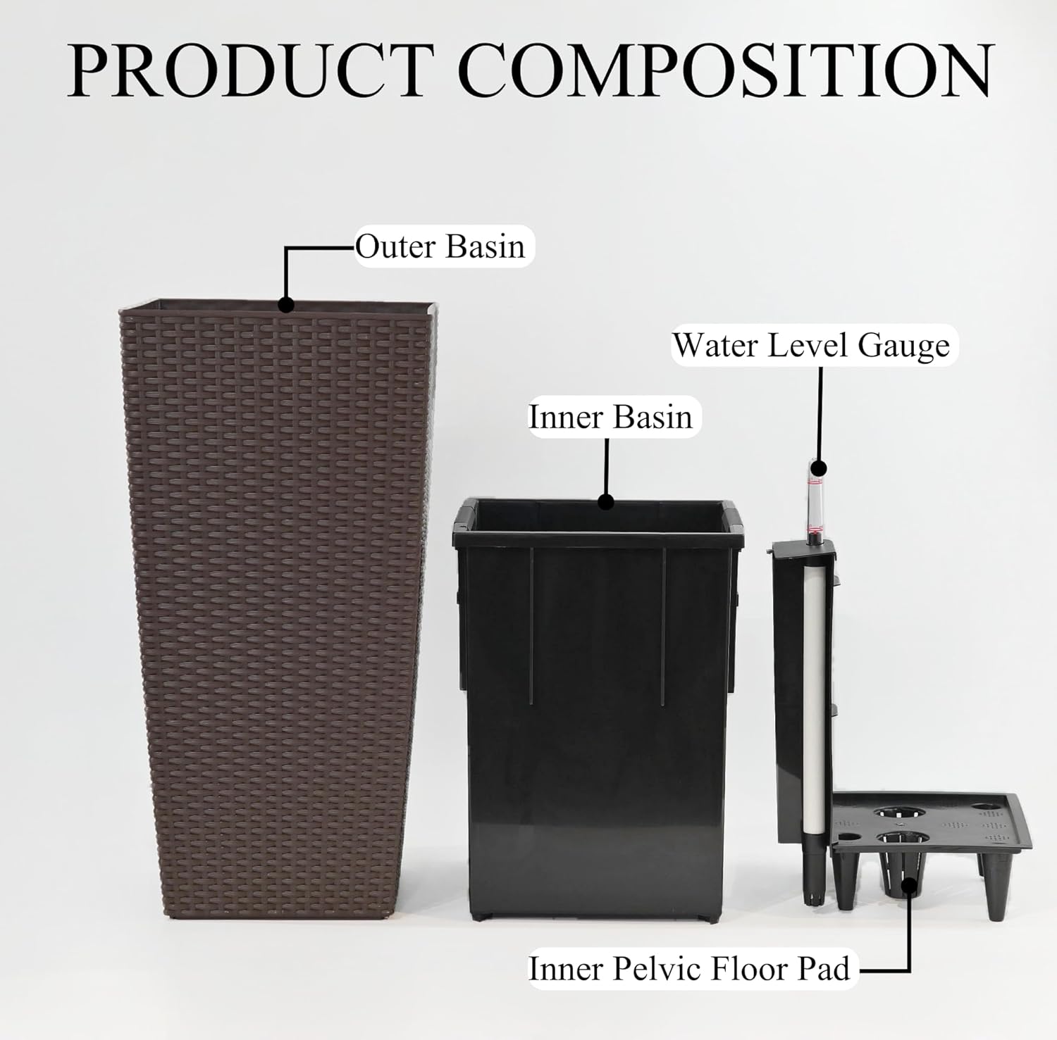2Pcs 23in High Large Plant Pots Planter-Self-Watering,Modern Planter with Drain Holes,Water Level Monitor,Inner Bucket for Indoor/Outdoor Front Porch Patio,Brown Rattan