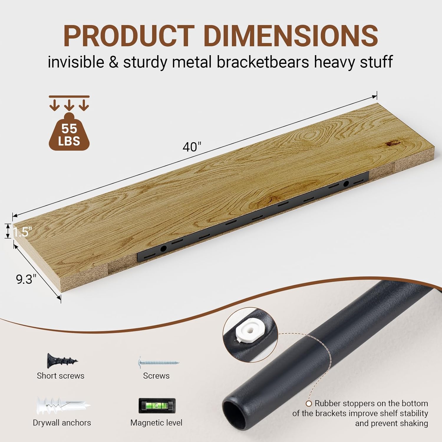 Heimlove 40 Inches Floating Shelves for Wall,9.3" Deep Oak Long Floating Shelves Set of 2,Large Display & Storage Shelf,Wall Shelf for Bathroom Bedroom Living Room Kitchen Office