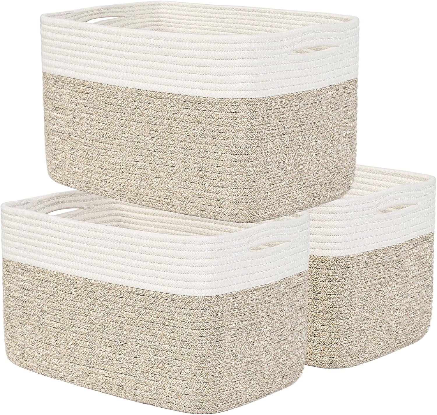 Shelf Baskets for Organizing, Woven Storage Basket for Shelves, Cotton Rope Storage Bins for Toys Books, Nursery Towel Baskets for Classroom, 14.96"X9.8"X8.85", 3-Pack White/Brown