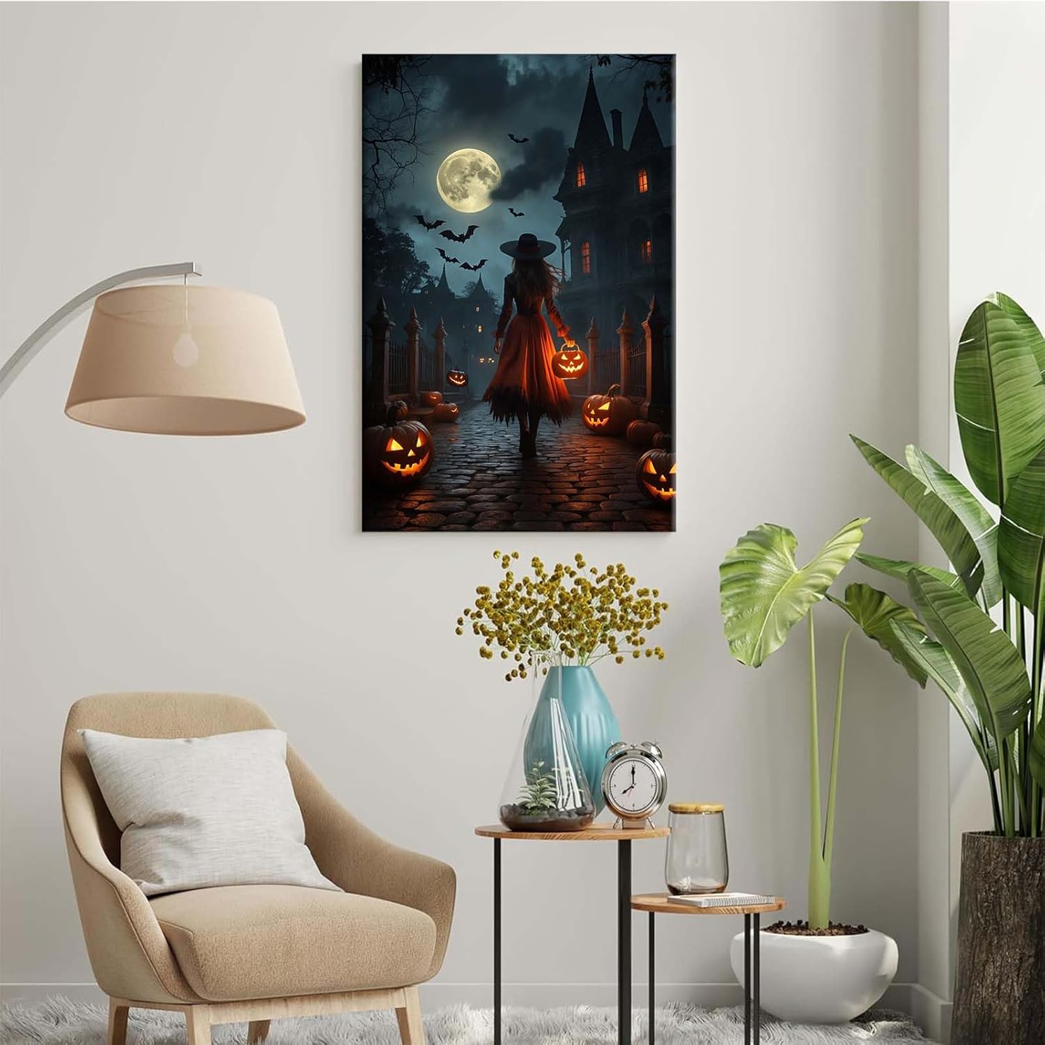 Halloween theme poster moonlit autumn night witch vintage poster art print dark college style gothic painting canvas wall decoration bedroom living room ideal gift12x16in Wood Framed