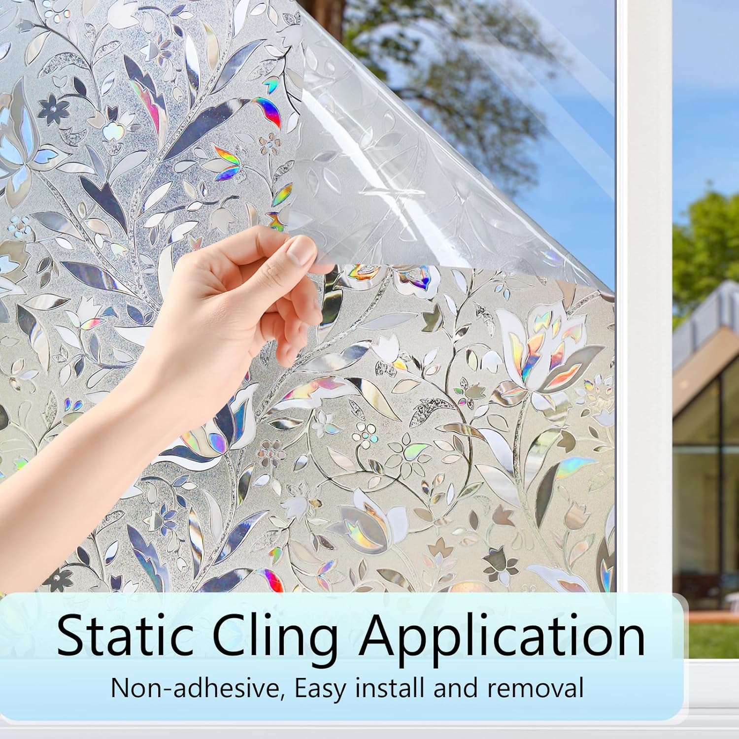 HIDBEA Window Privacy Film, 3D Stained Glass Static Cling - Sun Blocking Anti-UV Heat Control, Reusable Decorative Film for Home/Office Doors, Rainbow Tulip Design (23.6 in x 78.7 in)