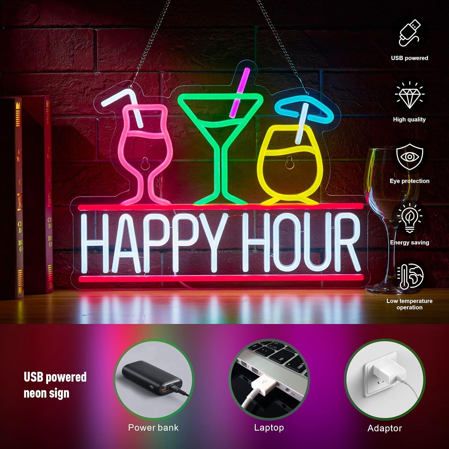 - 【Cool design】Happy hour bar neon sign. Made of soft silicon LED strip lights and clear acrylic board. Well made and packed.