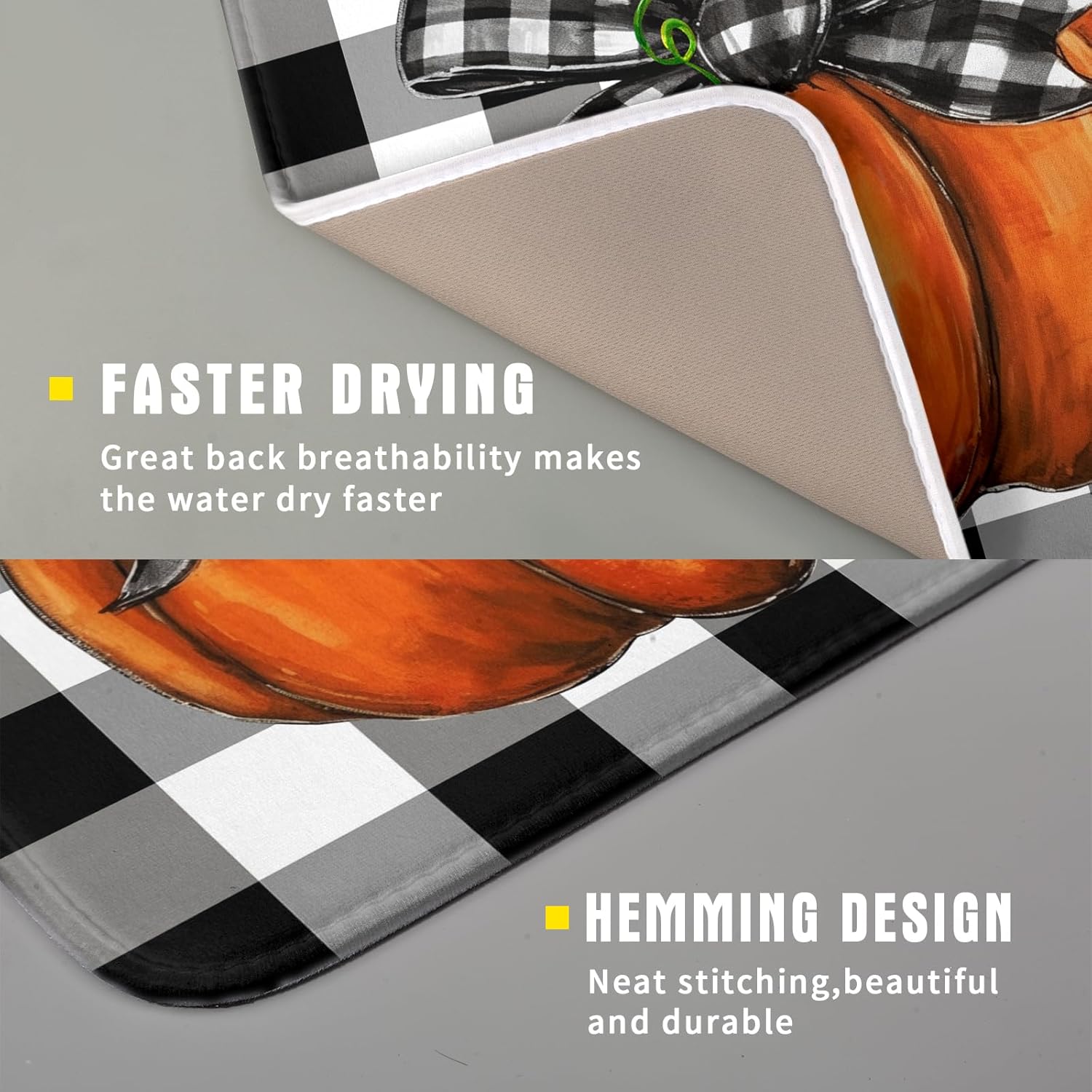 Fall Pumpkin Dish Drying Mat for Kitchen Counter Black White Buffalo Check Thanksgiving Super Absorbent Reversible Microfiber Kitchen Countertop Protector Dishes Pad Small 16x18 inch