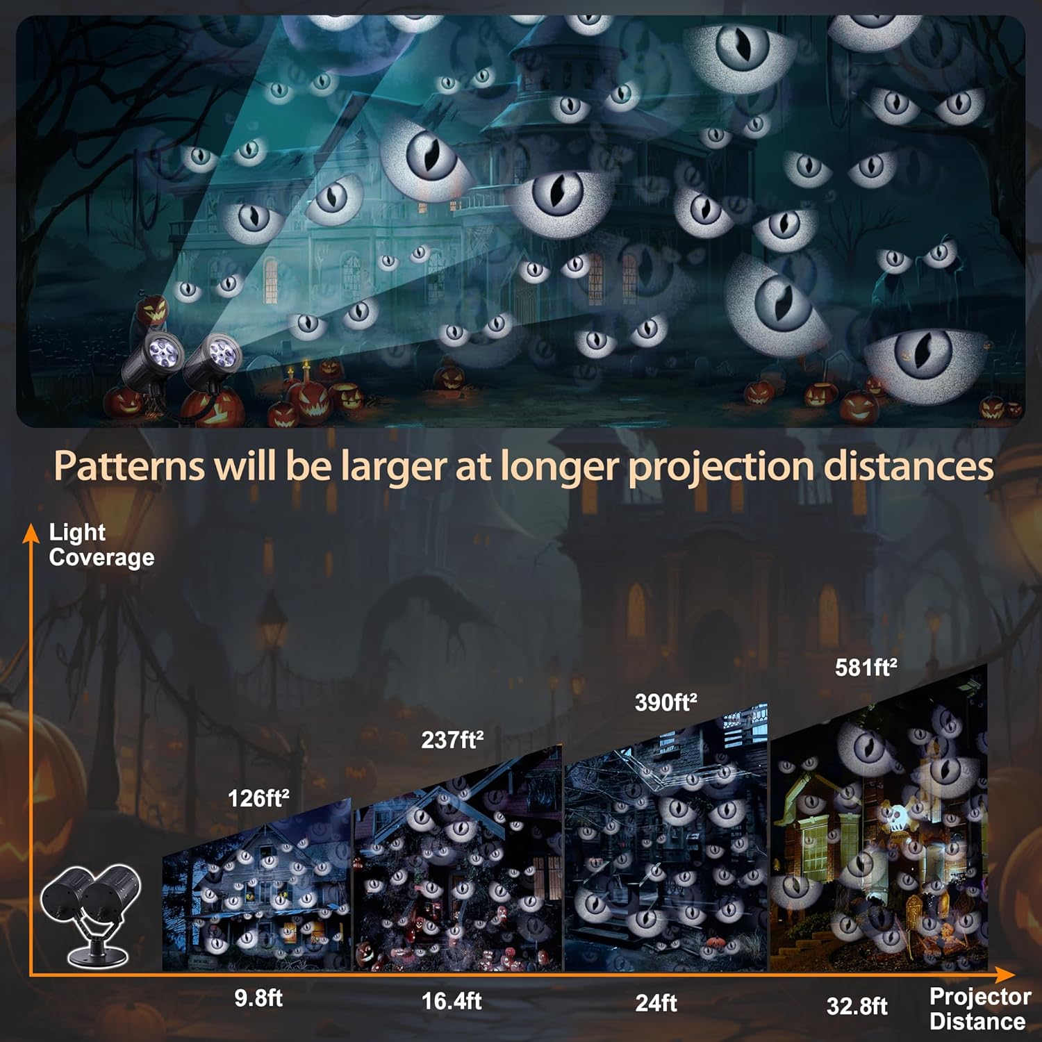 - 3-in-1 Decorations Projector: The Halloween Projector come with ground stake, base device, wall base screws, can be used for outdoor and indoor decorations. With 9.8ft lead cable, you can place the Halloween lights projector on flat surface, or mount it in ground, or mount it on wall, and it will give you an amazing Halloween atmosphere. It is recommended to place the projector at 16.4ft - 33ft for best result.