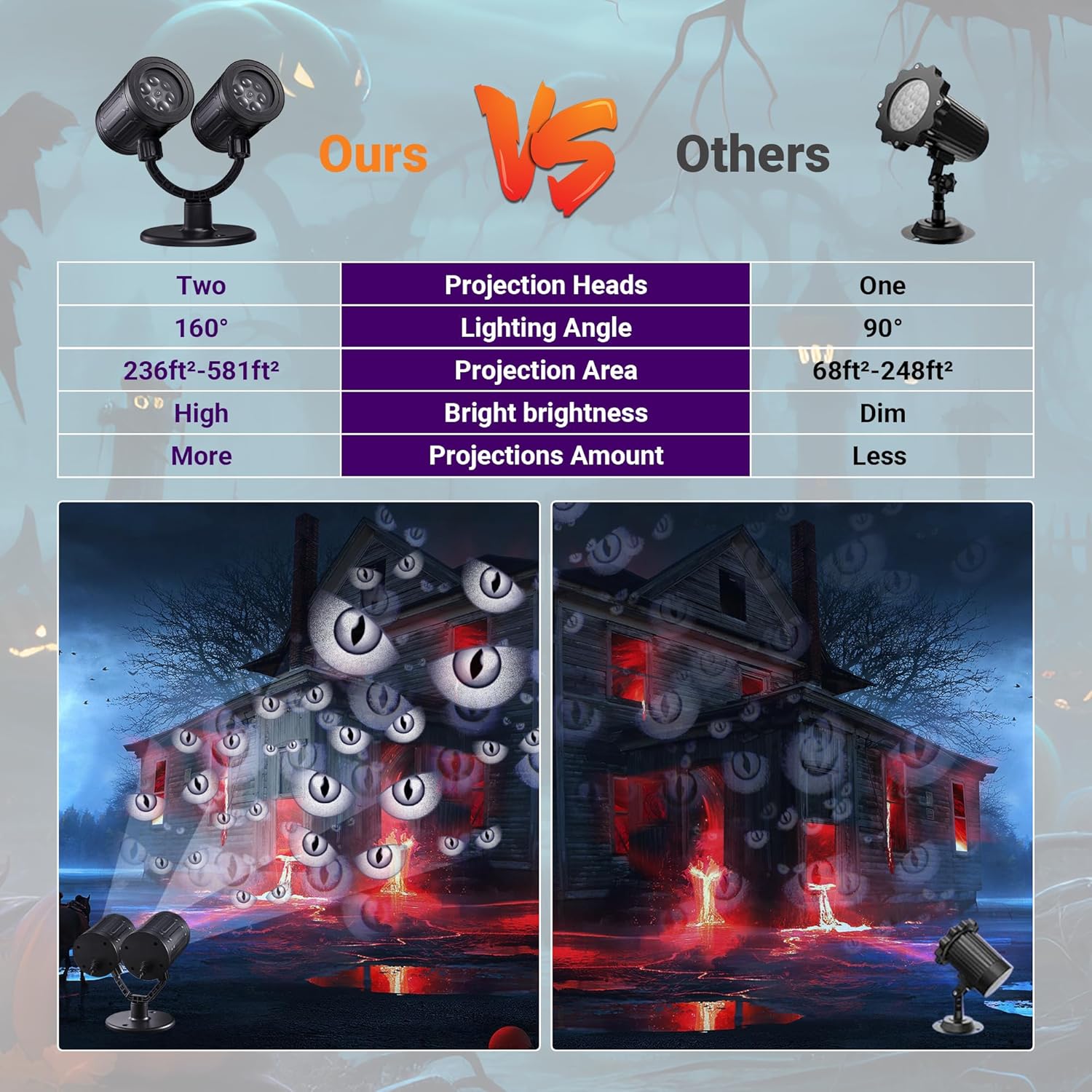 - Halloween Projector Lights: The Halloween projector with Grey devil's eyes pattern design, creating a eerie and creepy, colorful space projection atmosphere for your house, room, party, to show you a funny Halloween lighting sky. Great Halloween decorations Projector choice for you and your family.