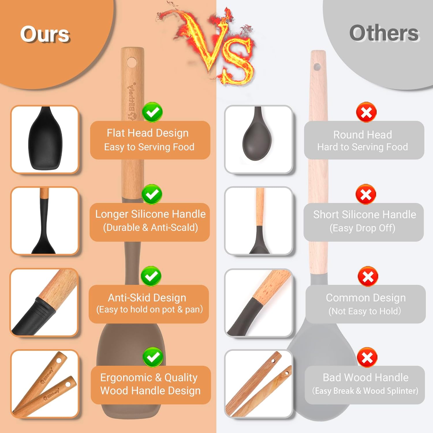 - 🥄【Comfortable & Ergonomic Wooden Handle】This Silicone Cooking Spoons are designed with natural wood handle. The smooth round handle can reduce hand fatigue during prolonged cooking sessions.The natural wood provides a secure grip, resists heat transfer, and complements modern kitchen aesthetics, and fits comfortably in your palm, offering precision for delicate tasks like flipping eggs or portioning pasta.