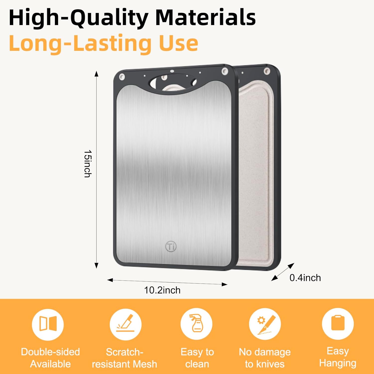 - 🍽️【Dual-sided Design】2 in 1 Pure Titanium-Wheat Straw PP Chopping Board. Titanium Cutting Board for Kitchen is designed with a high-quality titanium surface for cutting meat and a wheat straw PP surface for cutting vegetables and fruits. This food-grade cutting board ensures hygiene and safety, making it ideal for professional kitchens and home chefs