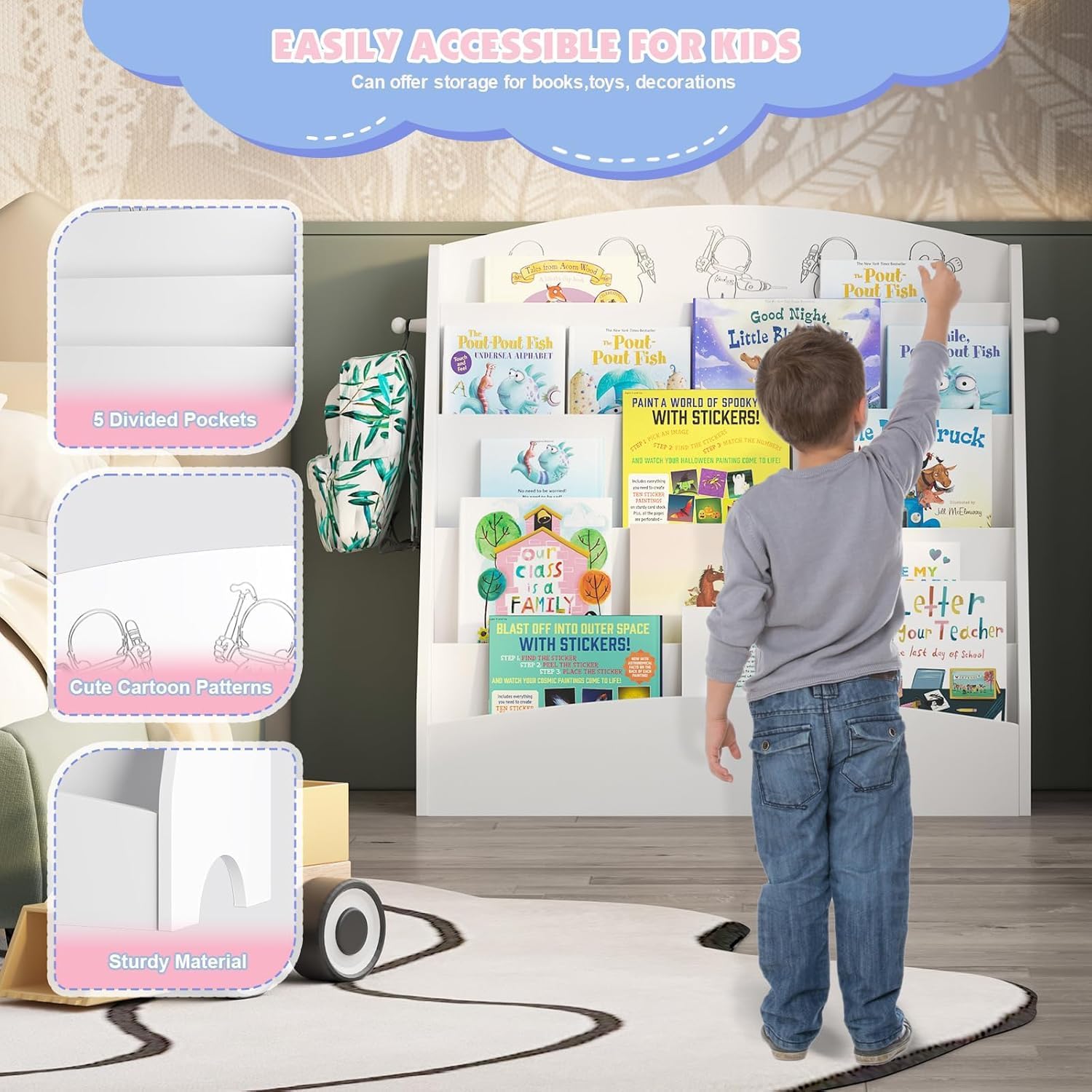 - 5-Tier Display and Storage Shelves: This 5-layer kids bookcase provides ample storage space for your children's storybooks, picture books, magazines, cardboard books, comics, and more. With reasonable depth, it is an ideal option for kids to categorize and organize their books and keep their room neat and clean.