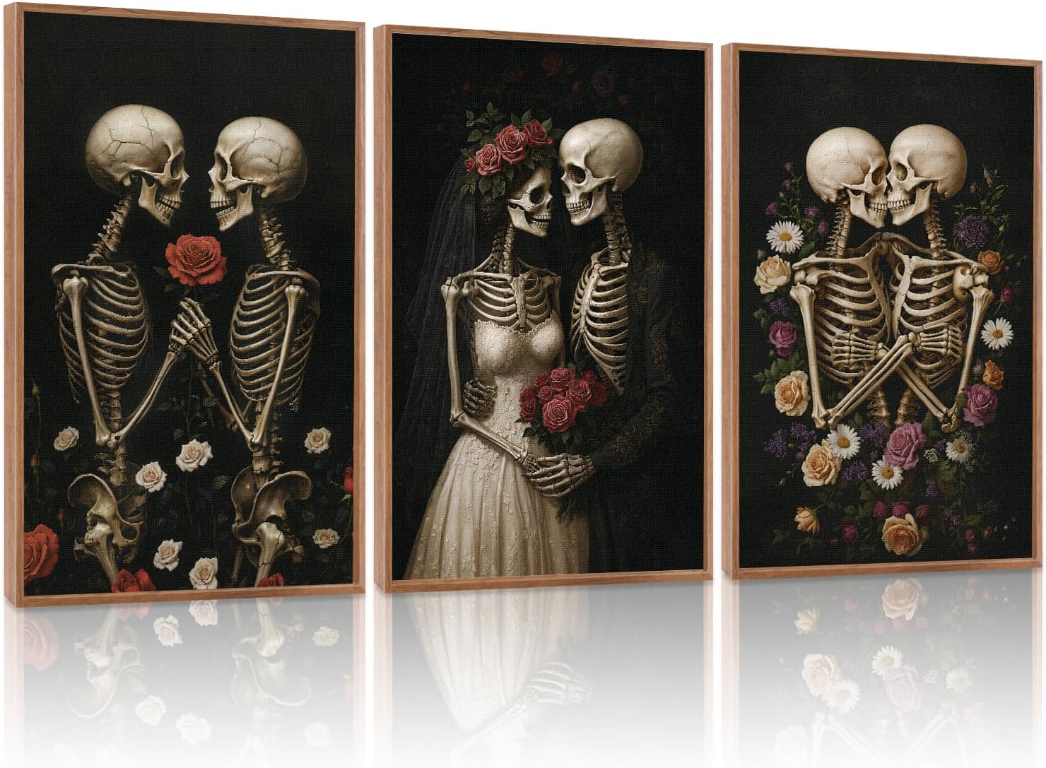 HLNIUC Halloween Rose Wedding Framed Wall Art,Vintage Skeleton Rose Canvas Prints,Abstract Romantic Theme Wall Decor Set of 3(16”x24”)Dark Romance Framed Painting,Roses Skull Art Print for Living Room