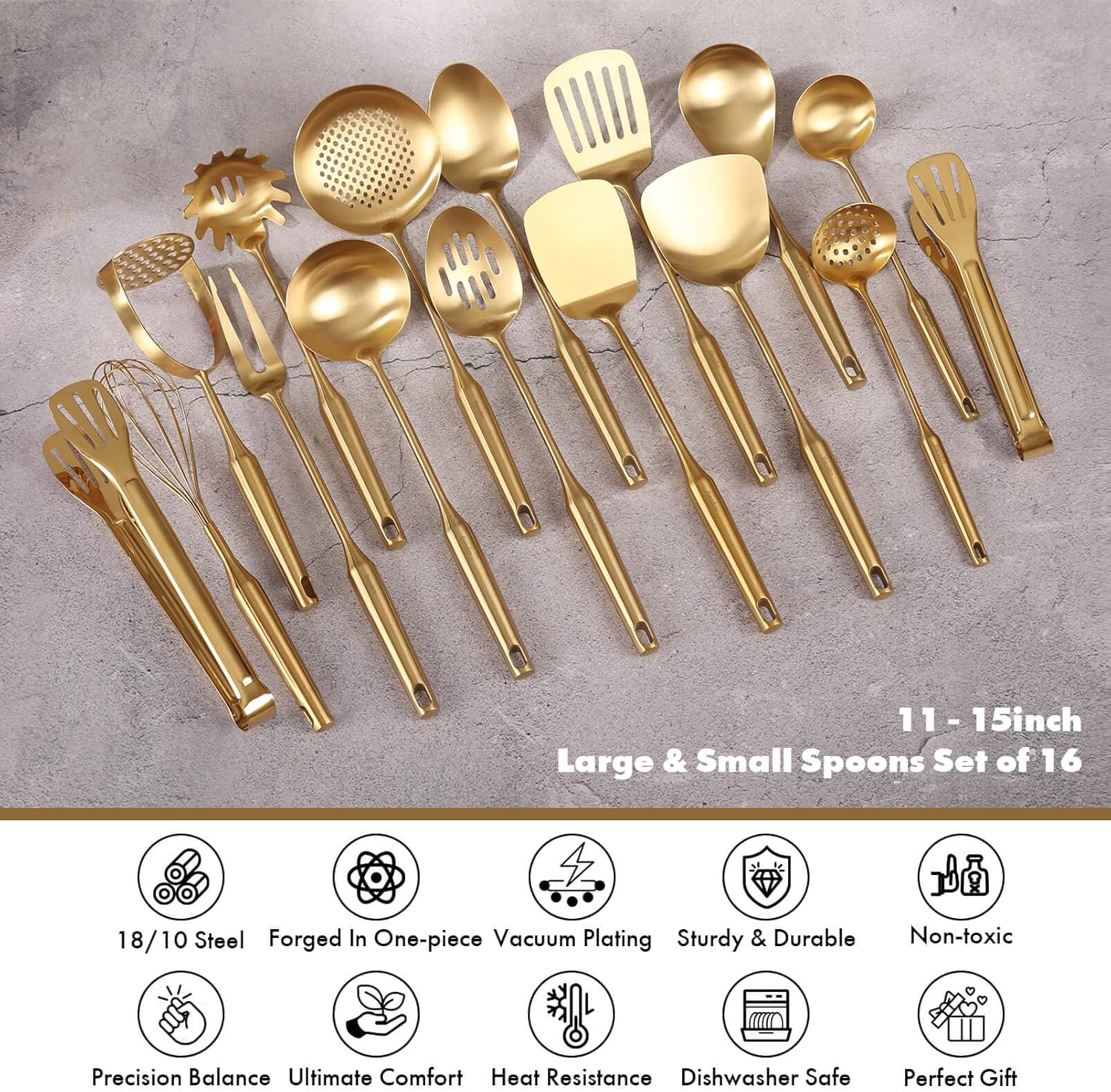 - 【Versatile Brass Serving Utensils】: 16-Pieces, 2 tongs, 1 whisk, 1 potato masher, 1 meat fork, 1 slotted spatula turner, 1 solid spatula turner, 1 solid serving spoon, 1 slotted serving spoon, 1 wok spatula, 1 skimmer spoon, 1 large spoon, 1 spaghetti server, 1 soup ladle, 1 small soup ladle, 1 small slotted spoon. These premium utensils are safe to use for cooking any type of food and idea gift for friends and family who love cooking with premium quality kitchen utensils